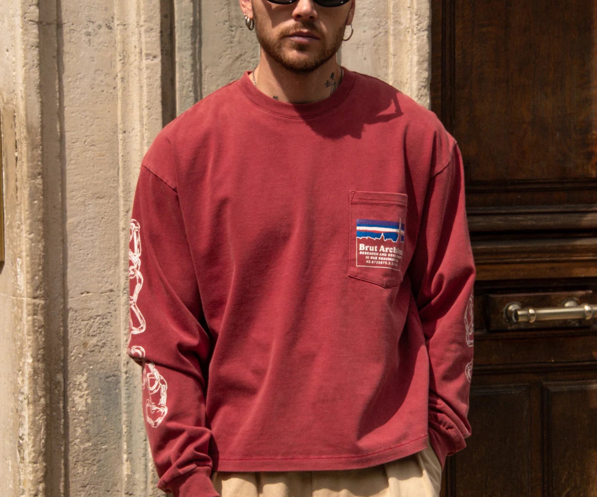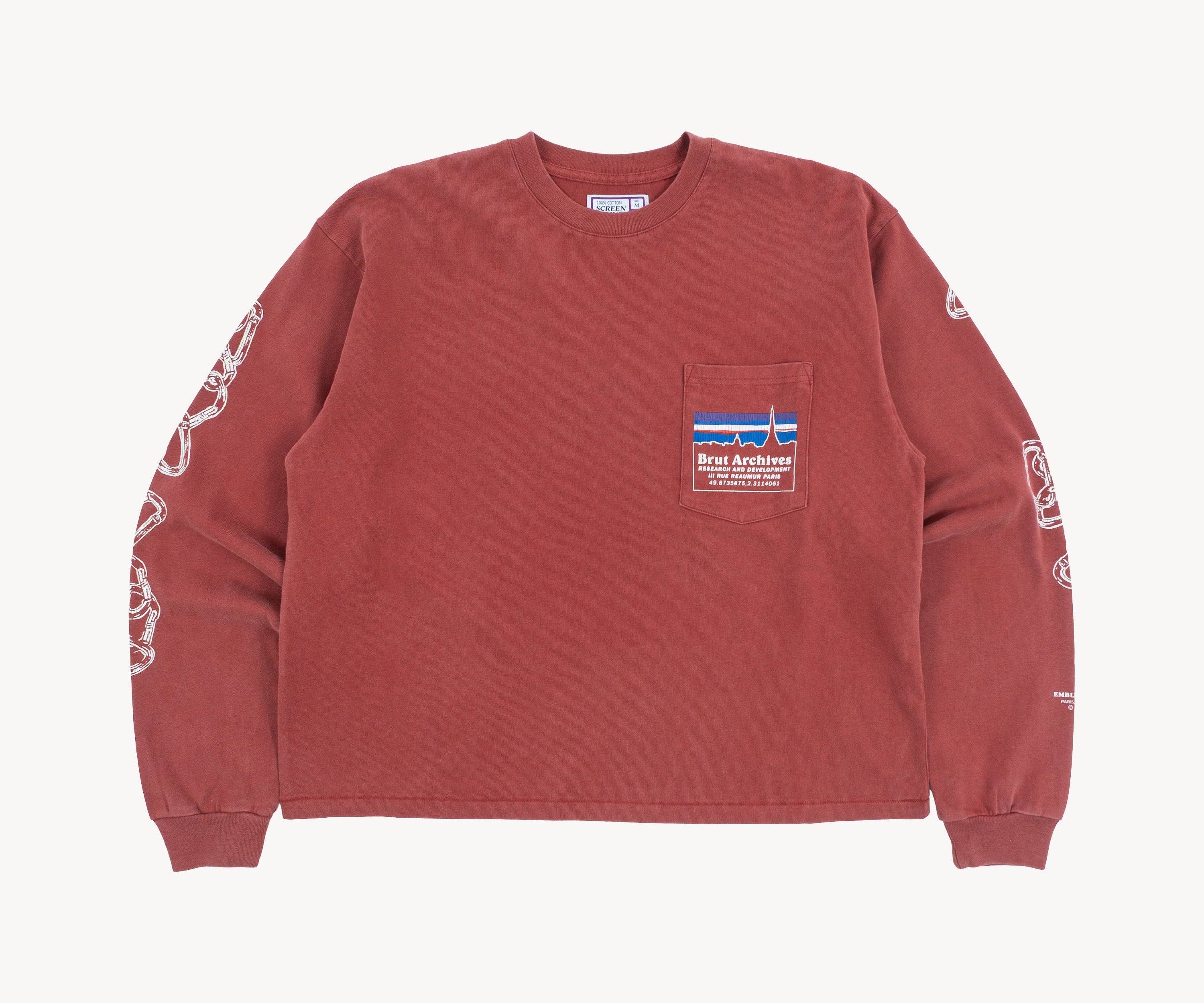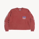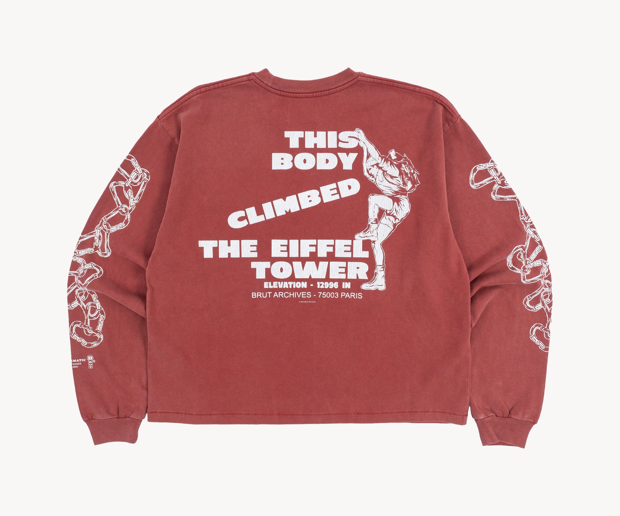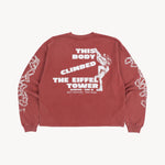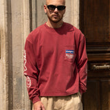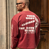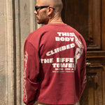 This red long-sleeve tee features a vintage print, drawing inspiration from outdoor sports gear, especially "trophy" shirts from climbing, trail running, and hiking. All of it comes with a touch of irony and humor. Made from soft yet durable cotton, it offers both comfort and longevity, perfect for a casual yet stylish look.