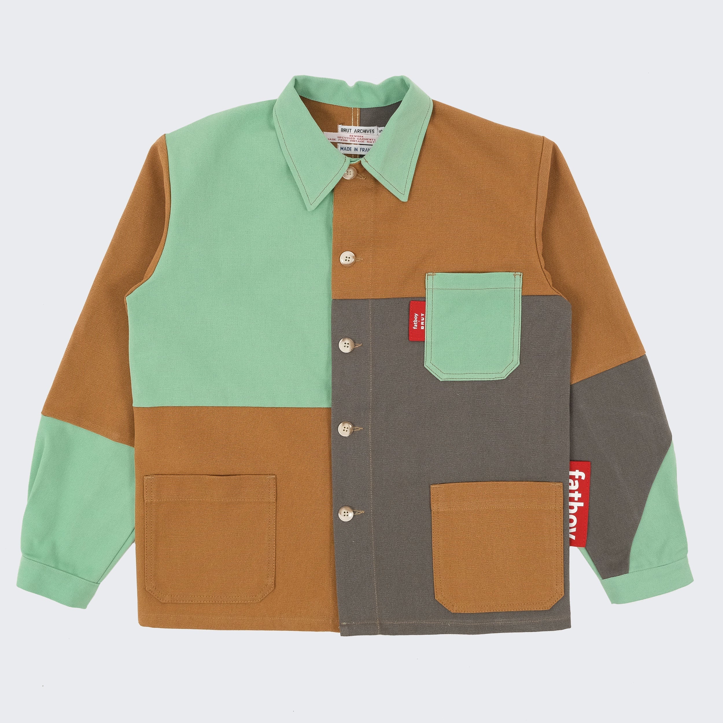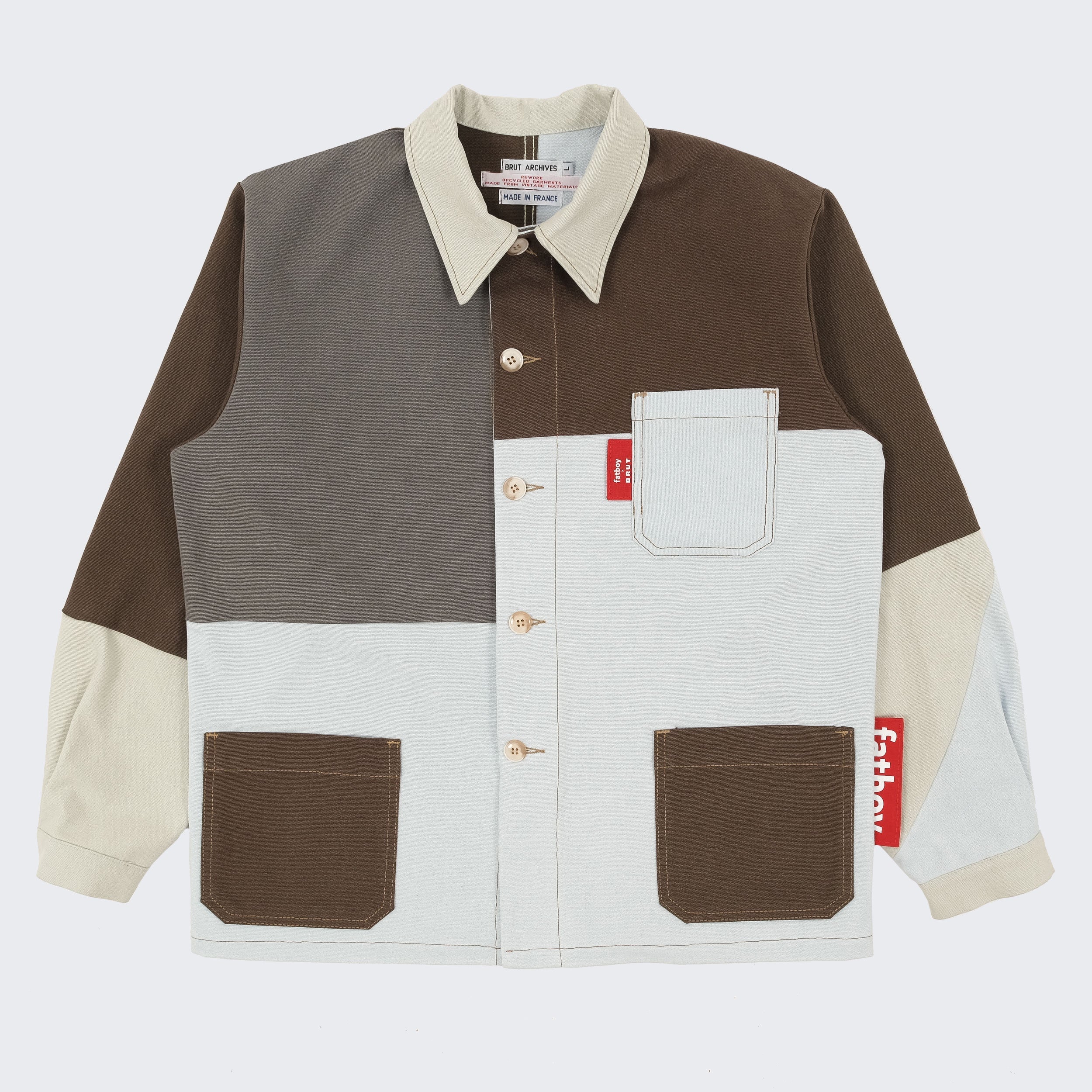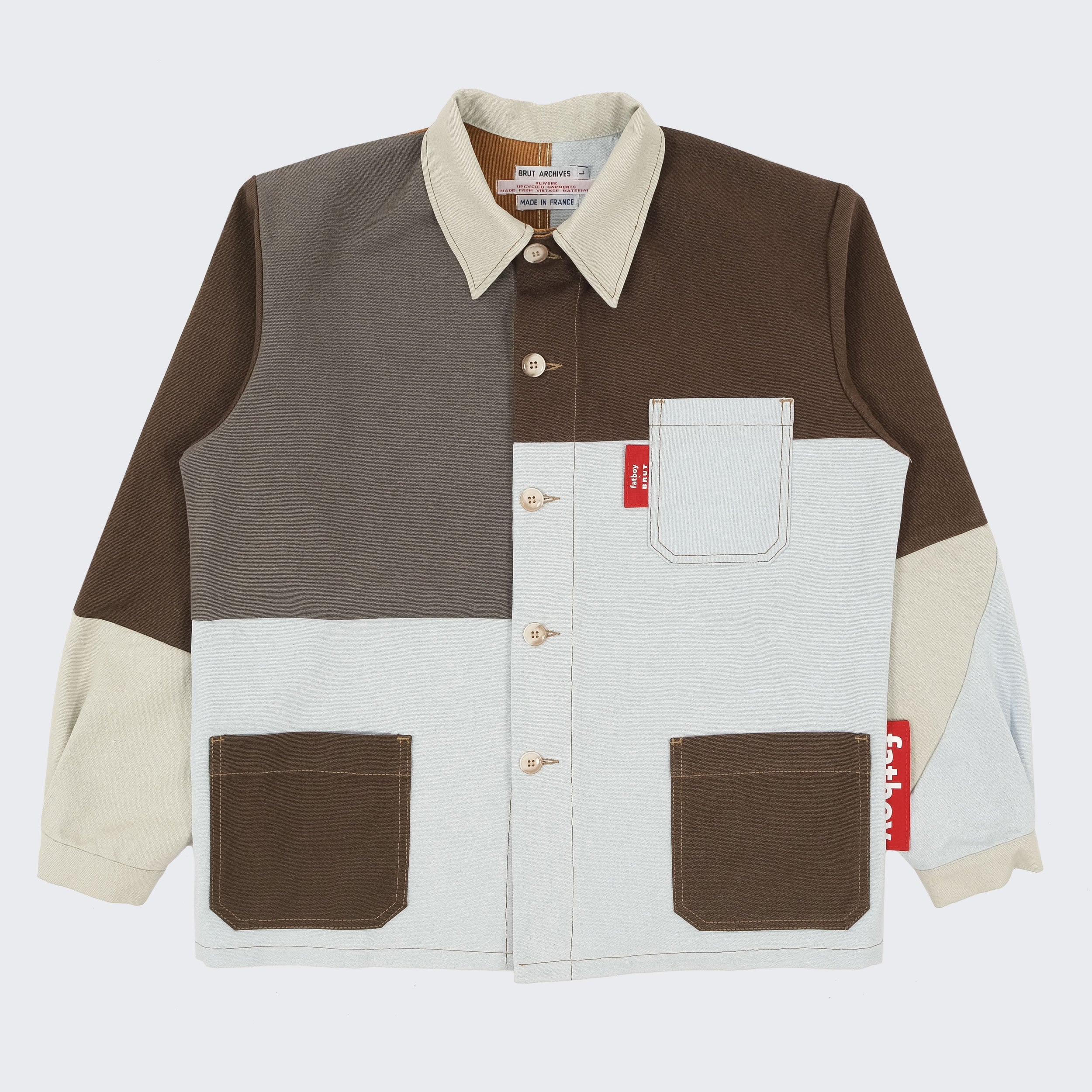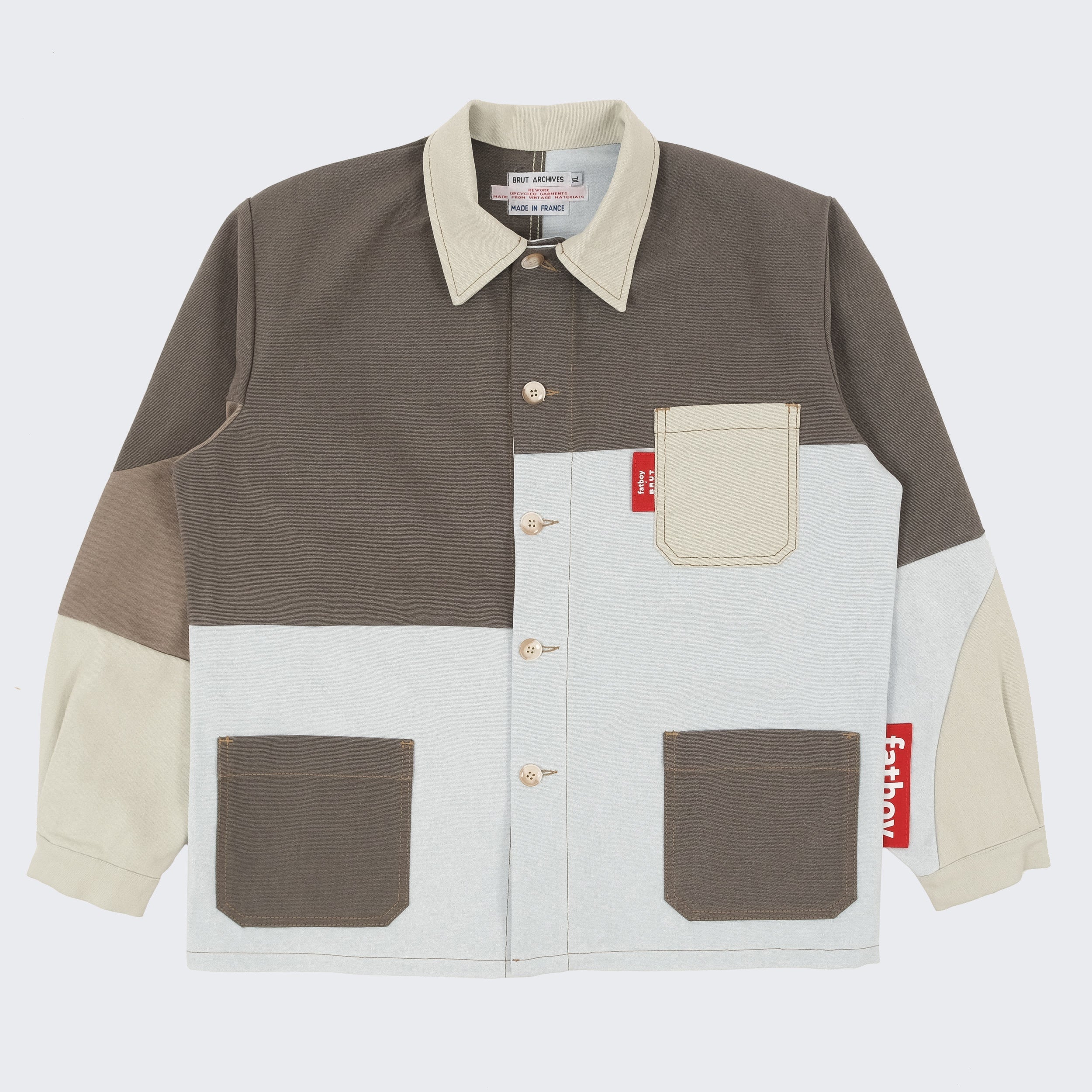 Fatboy opened the doors of its warehouse to BRUT, giving access to a selection of pre-used beanbags. From there, our team reworked the original fabric into new one-of-a-kind pieces. Each panel was cut, reassembled and stitched by hand in our Parisian atelier. The result: a set of chore jackets that carry the traces of their past use, now transformed into functional and timeless designs.