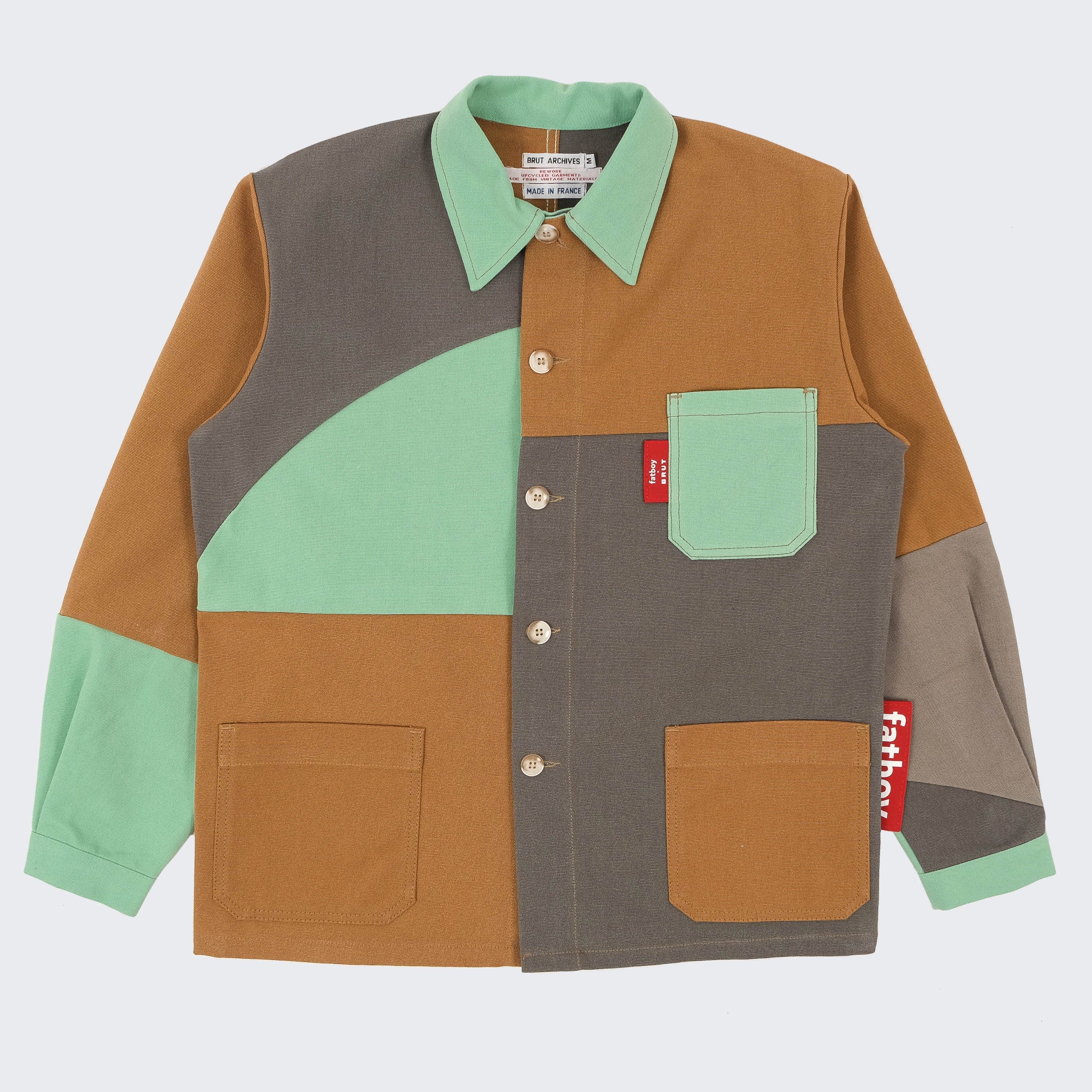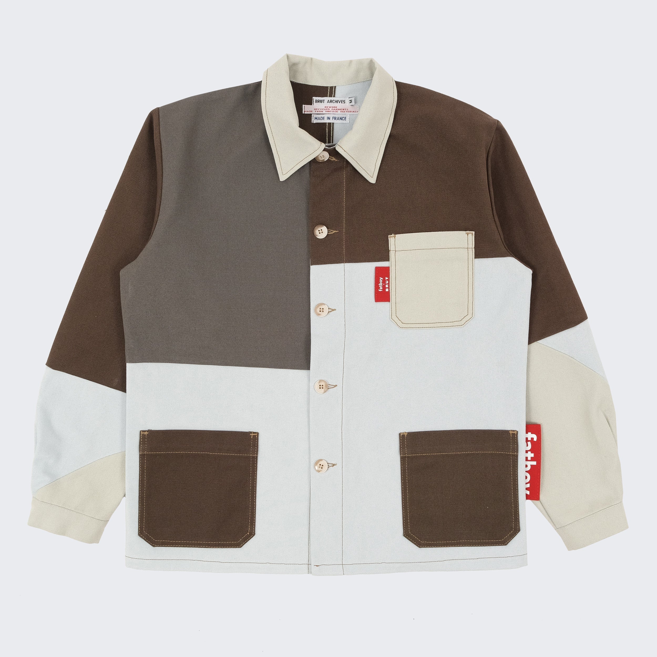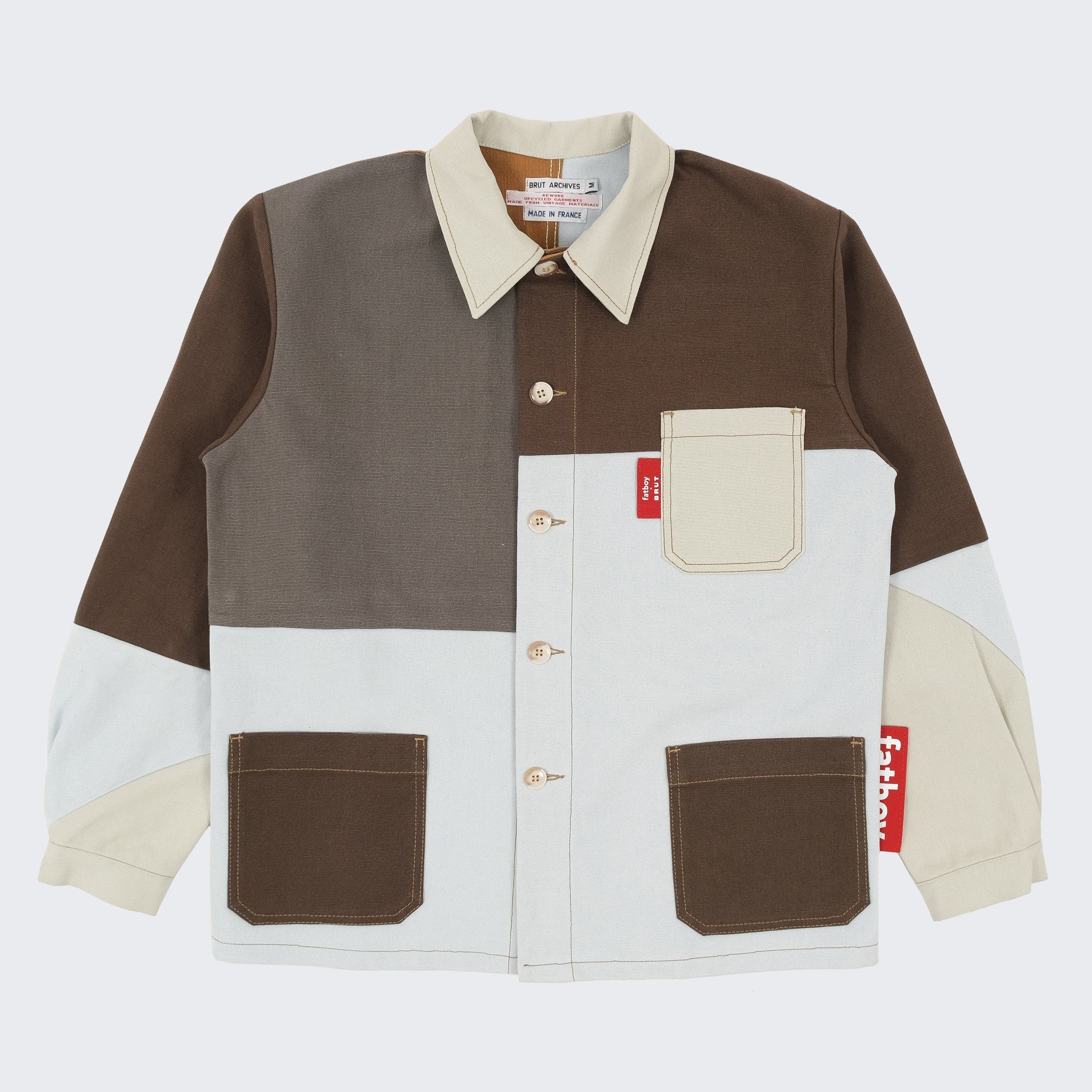 Fatboy opened the doors of its warehouse to BRUT, giving access to a selection of pre-used beanbags. From there, our team reworked the original fabric into new one-of-a-kind pieces. Each panel was cut, reassembled and stitched by hand in our Parisian atelier. The result: a set of chore jackets that carry the traces of their past use, now transformed into functional and timeless designs.
