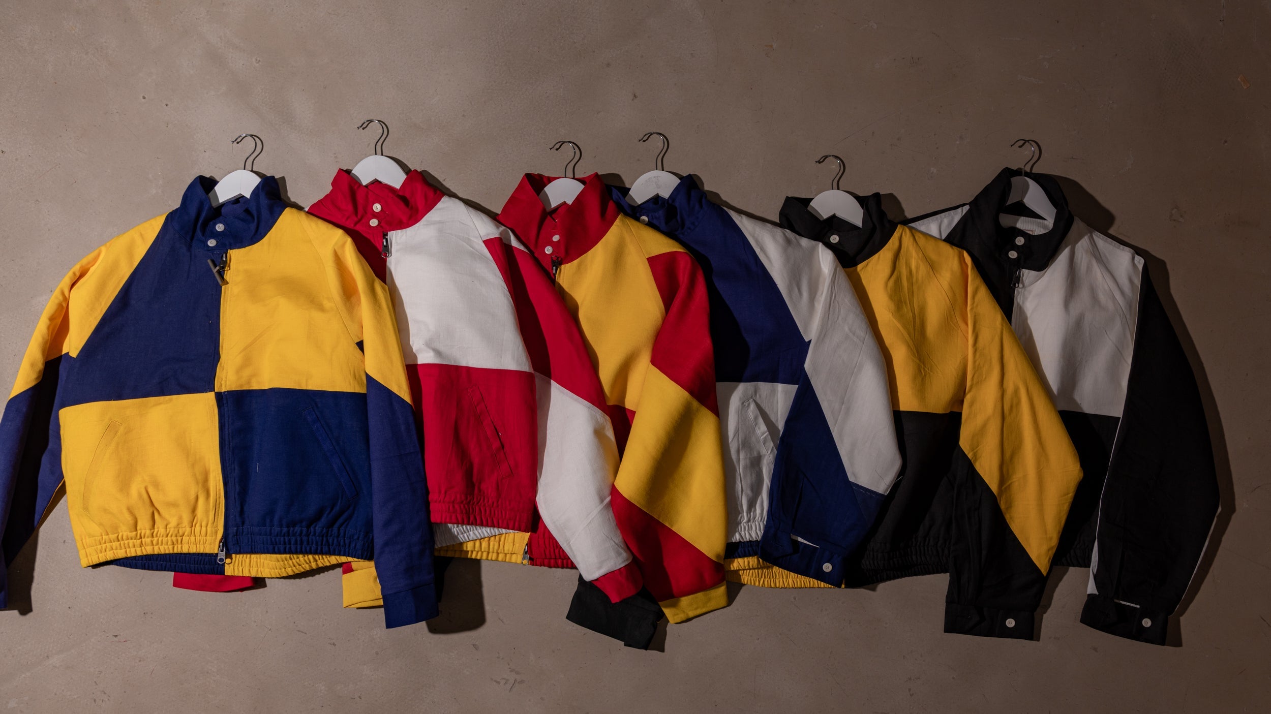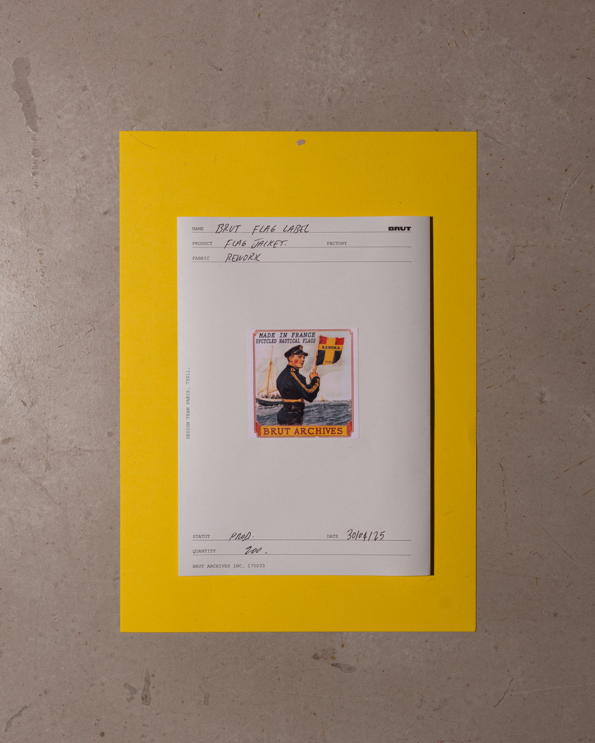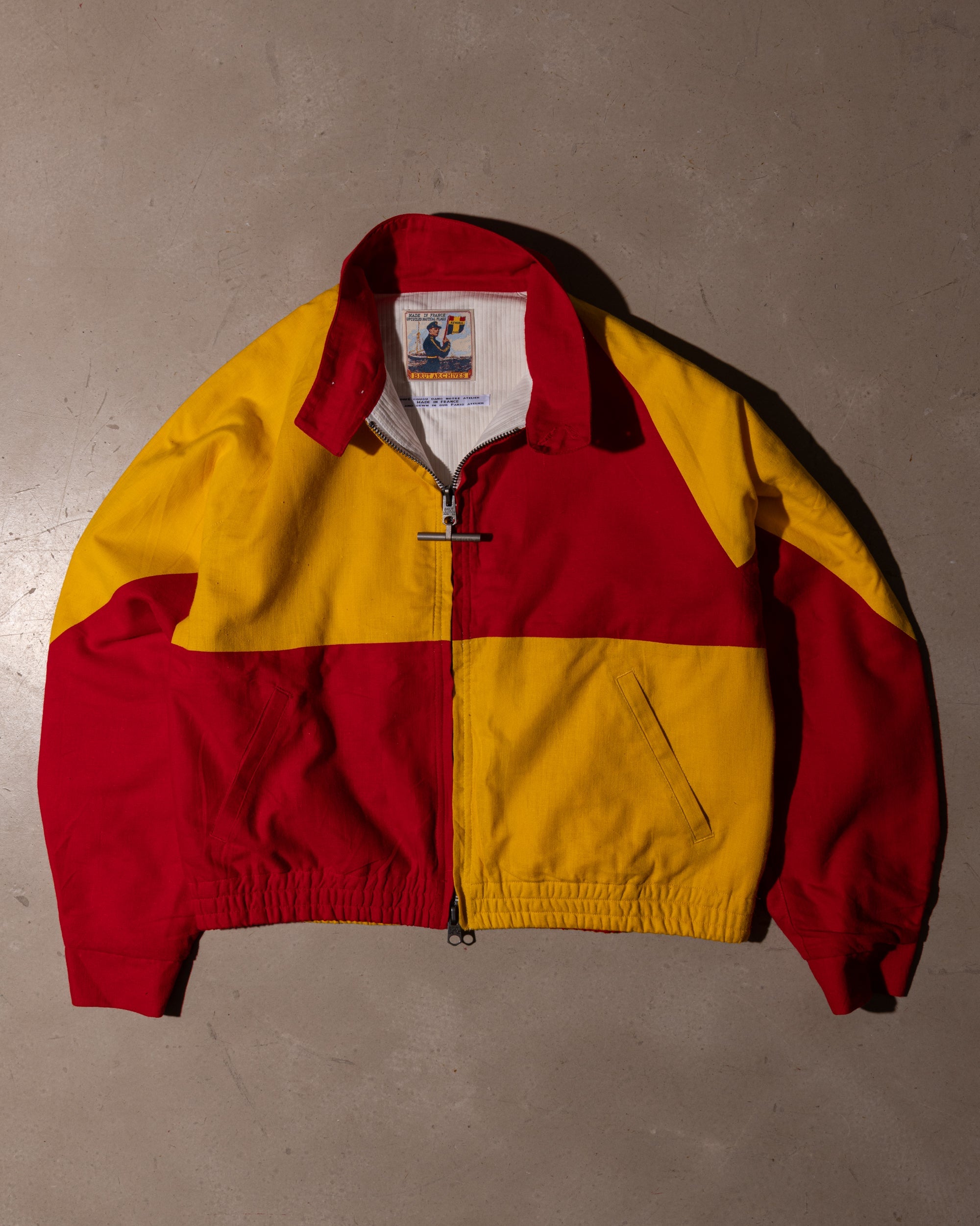 The Rework Flag Jacket is crafted in our Parisian atelier from authentic vintage nautical flags. The process begins with recovered textiles, cut and balanced by hand, turning fabric once exposed to salt and wind into a structured silhouette.