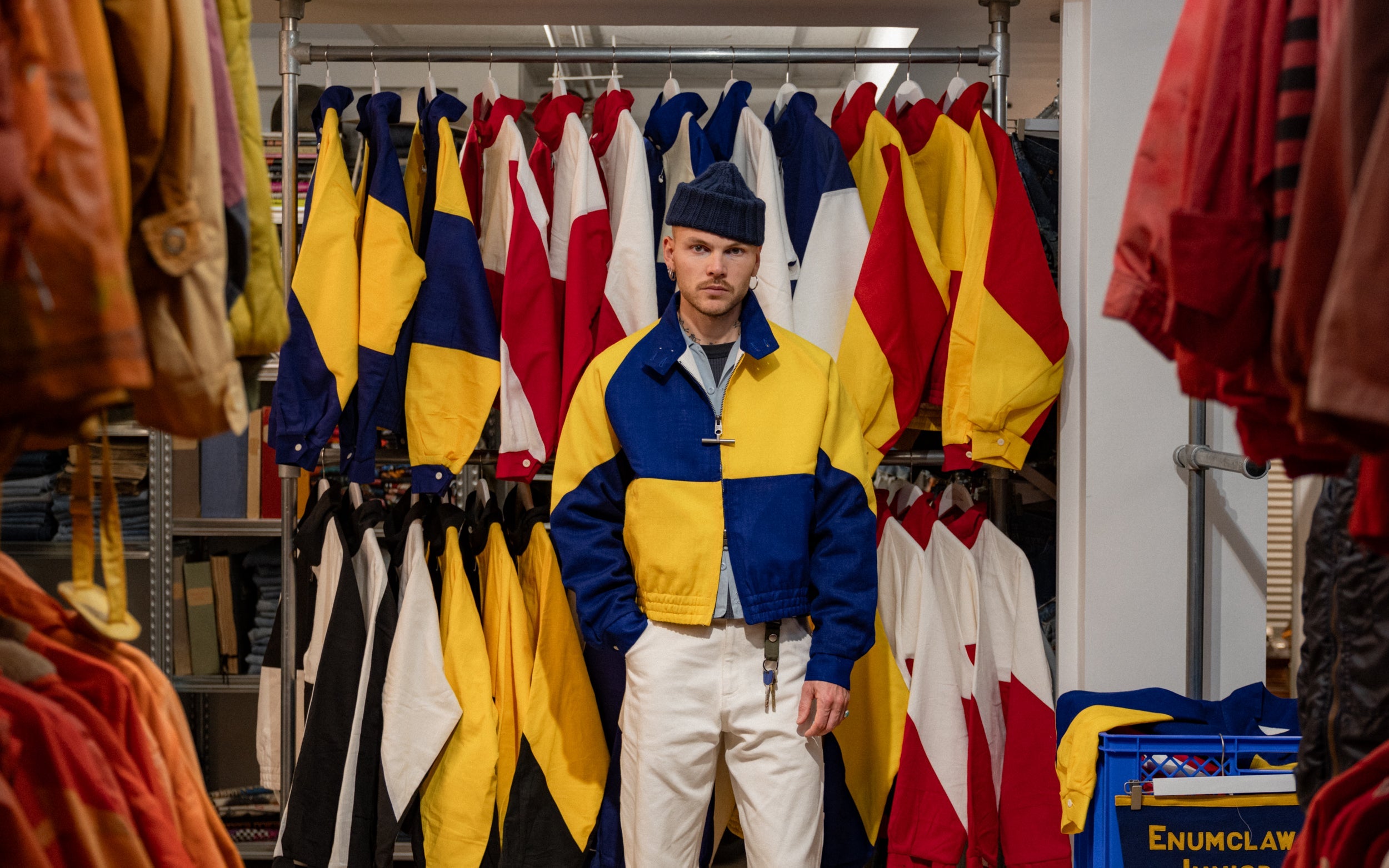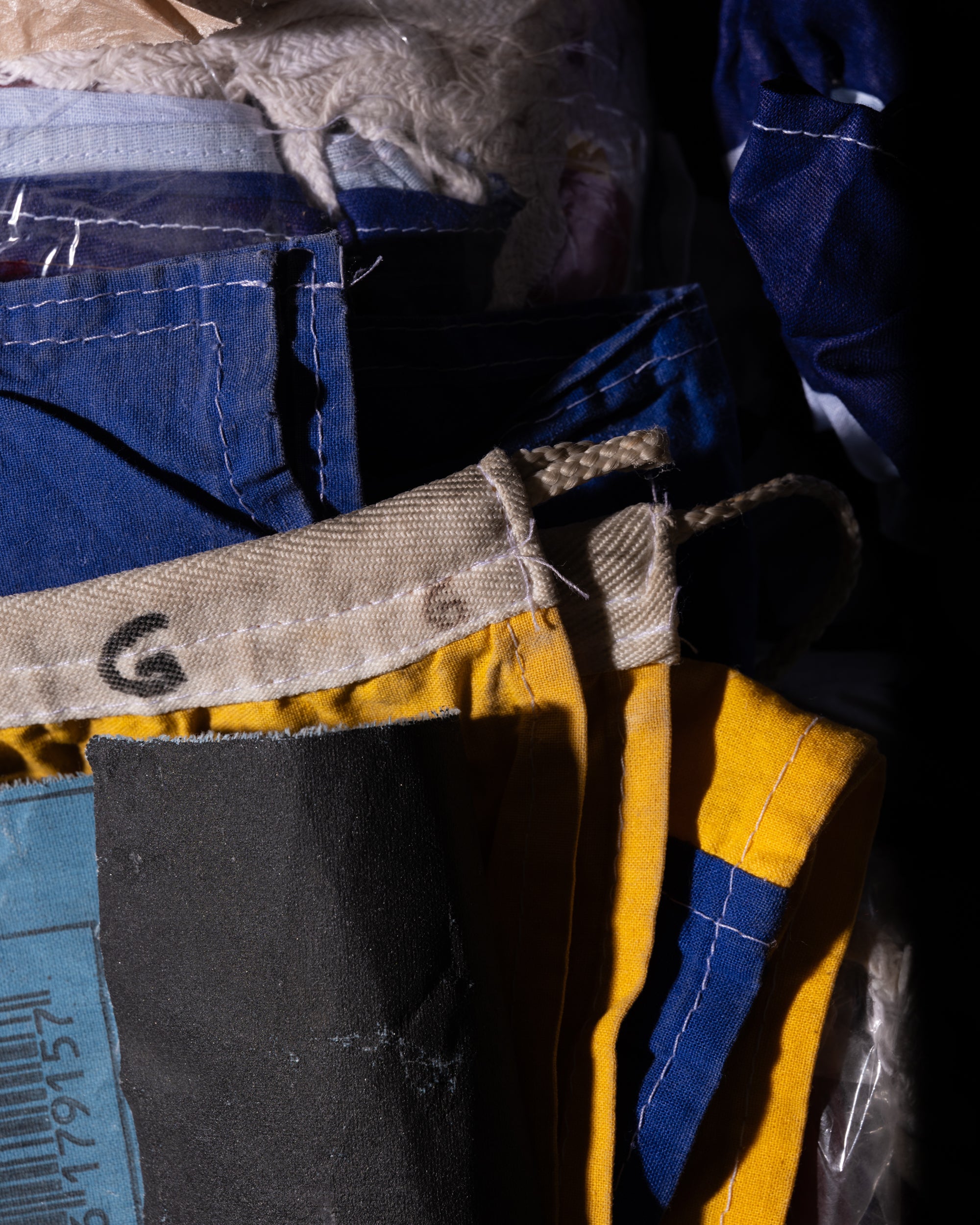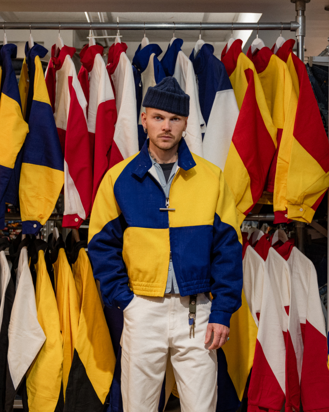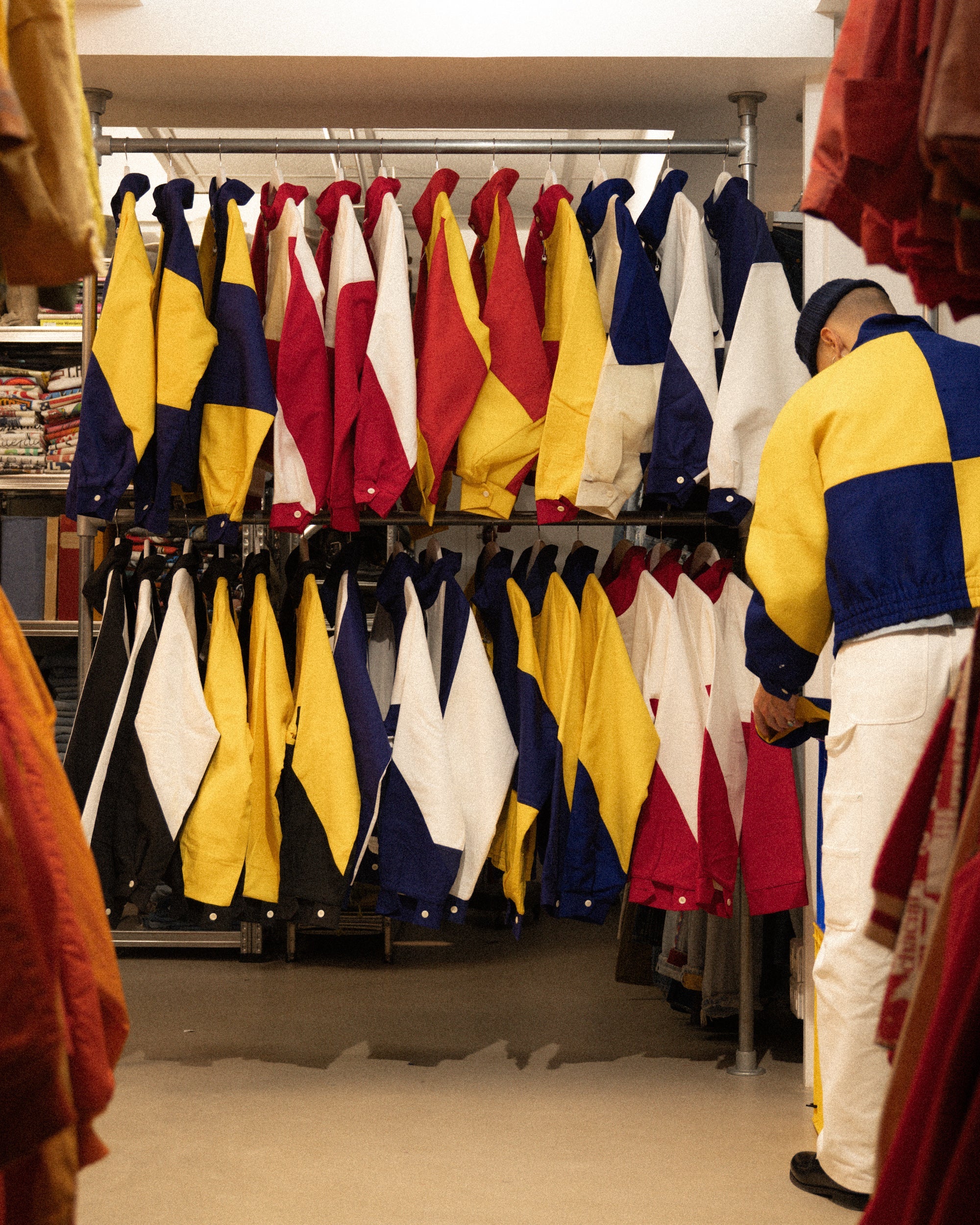 The Rework Flag Jacket is crafted in our Parisian atelier from authentic vintage nautical flags. The process begins with recovered textiles, cut and balanced by hand, turning fabric once exposed to salt and wind into a structured silhouette.