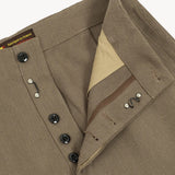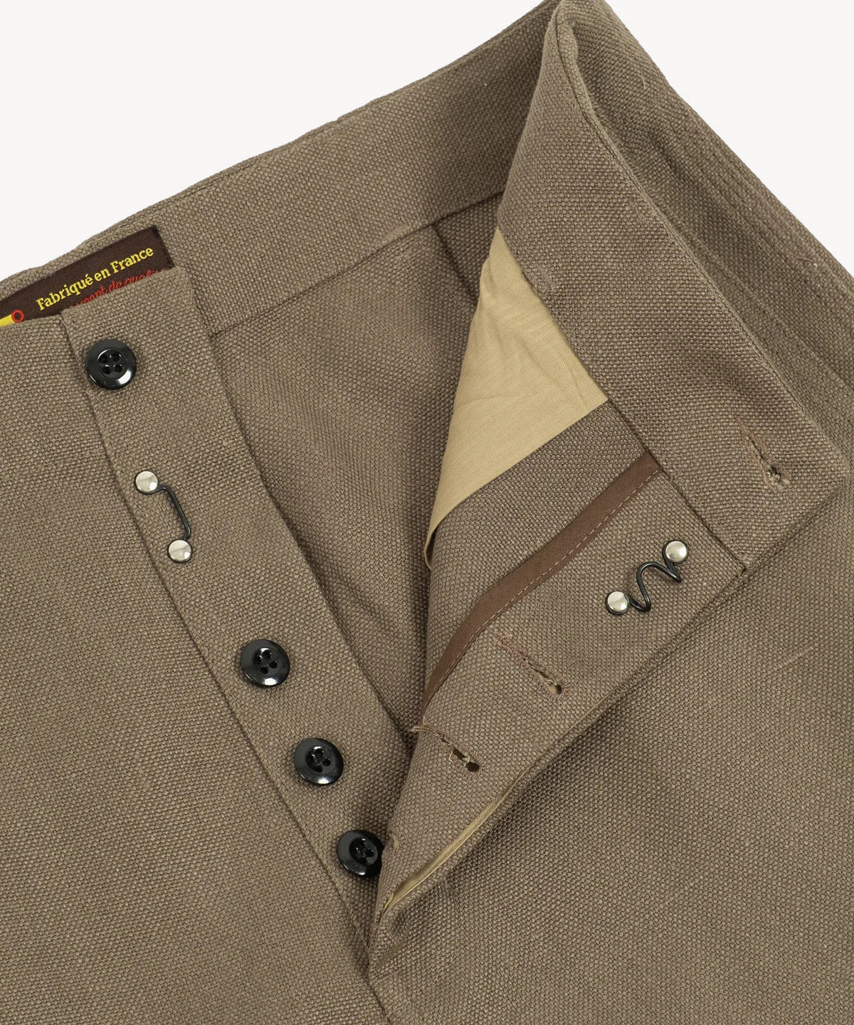 Button fly with 1960's metal military buttons and hidden hook.