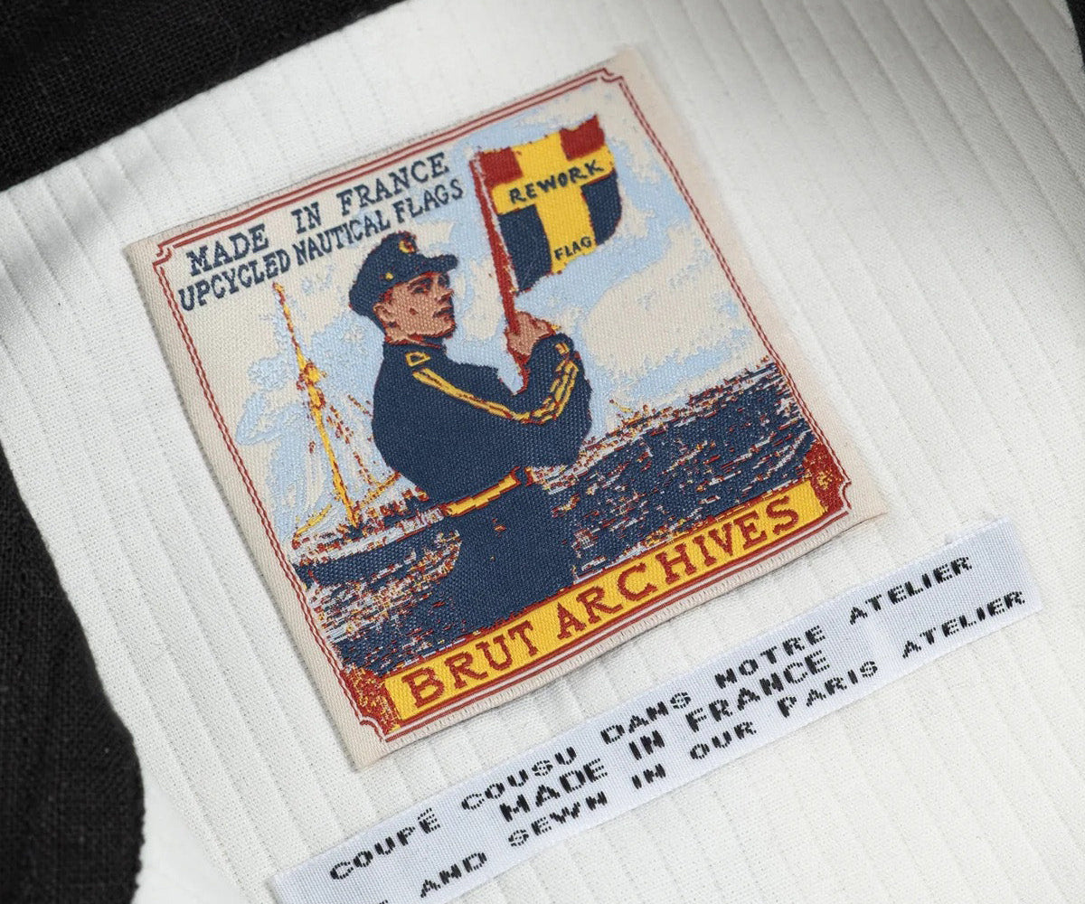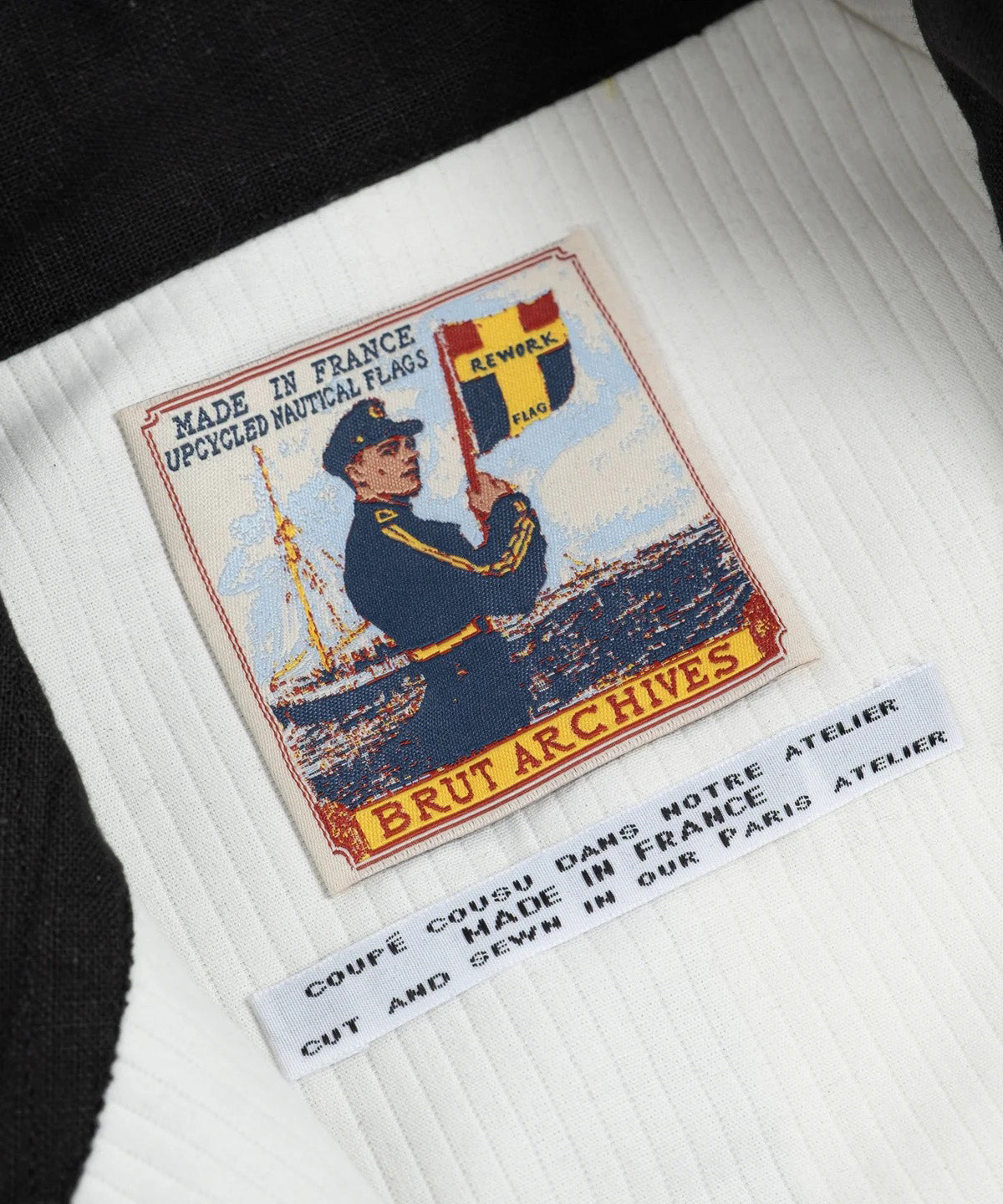 Crafted in our Parisian atelier from authentic vintage nautical flags, carefully reassembled into a bold patchwork design. Each panel carries its own story, showcasing the marks, colors, and textures of its past life at sea. One-of-a-kind.