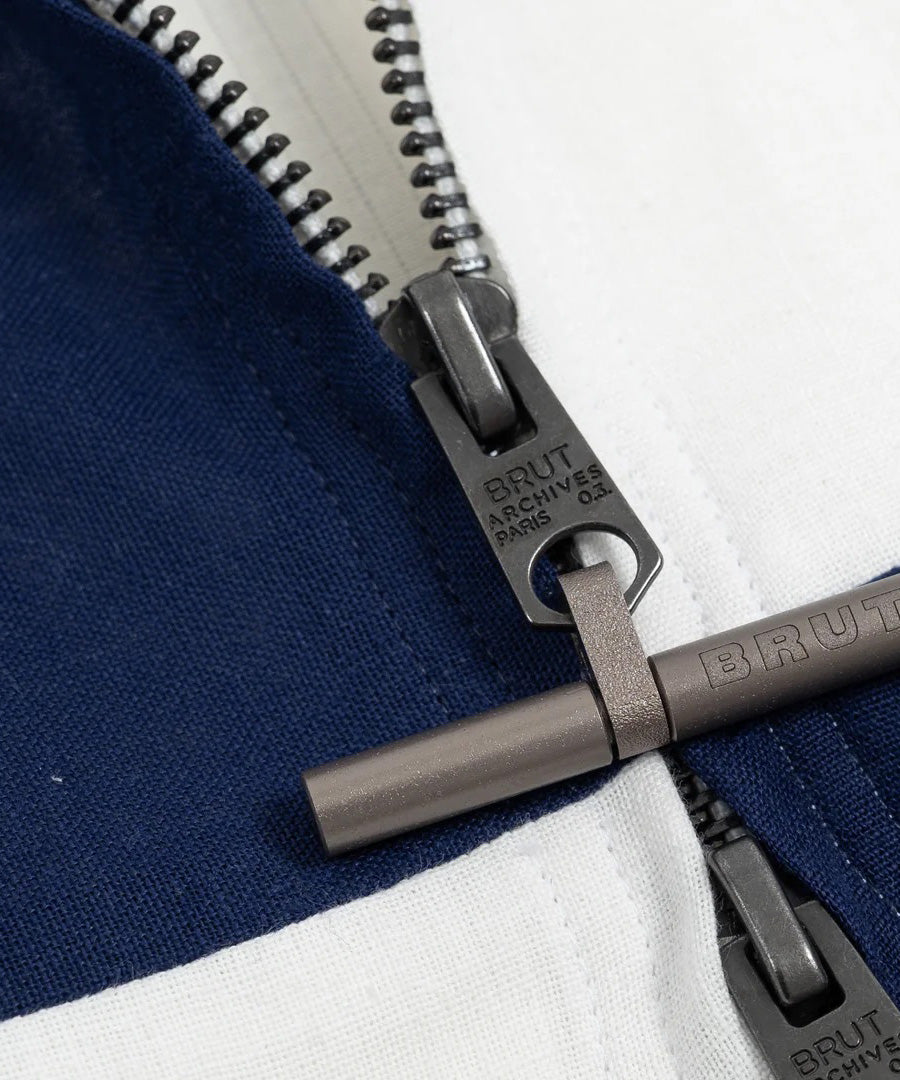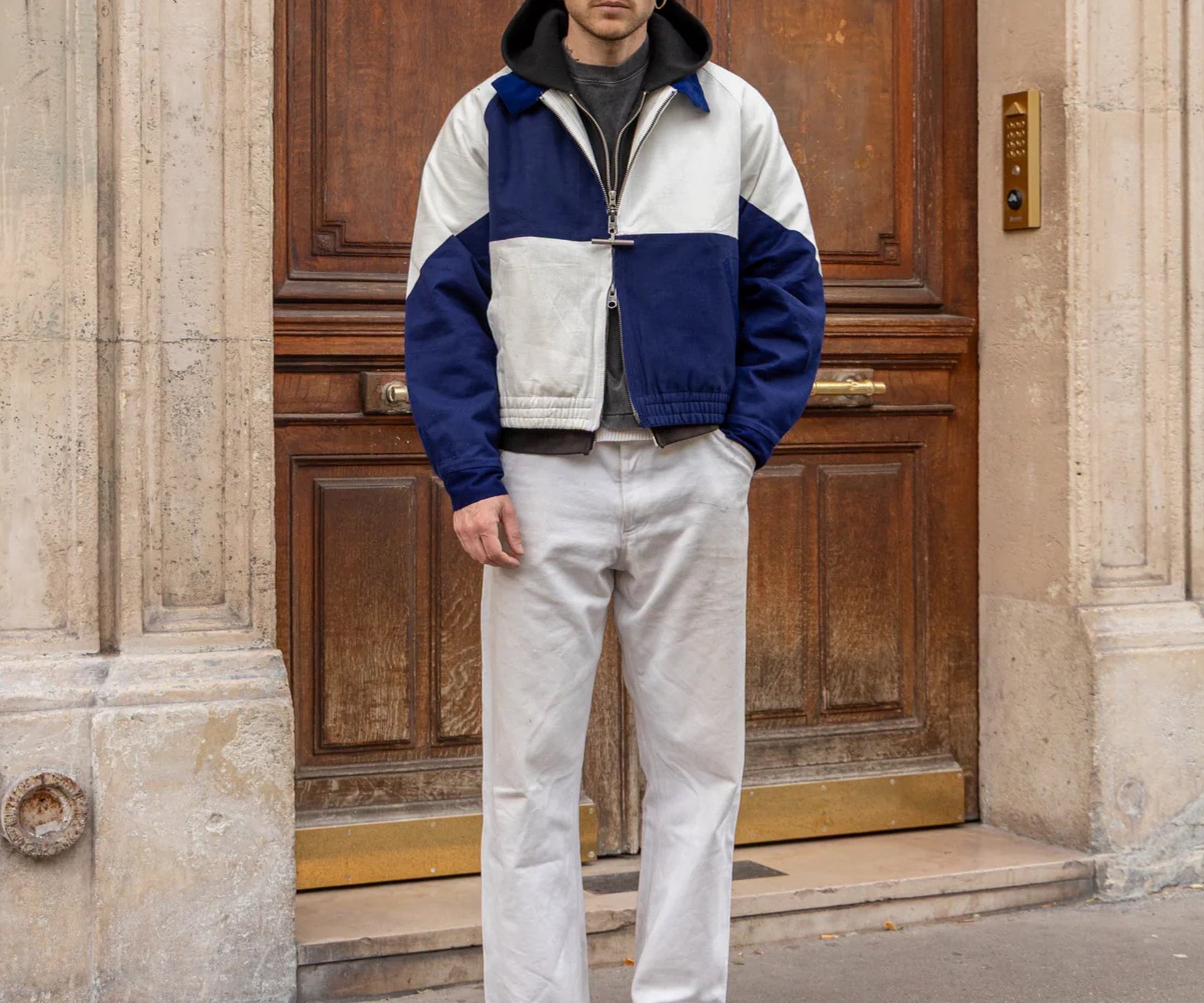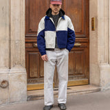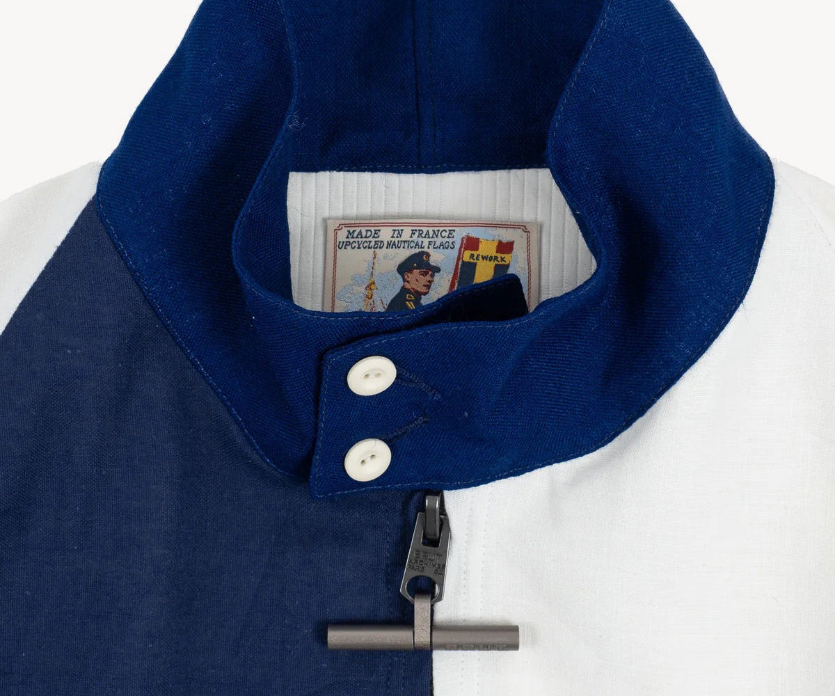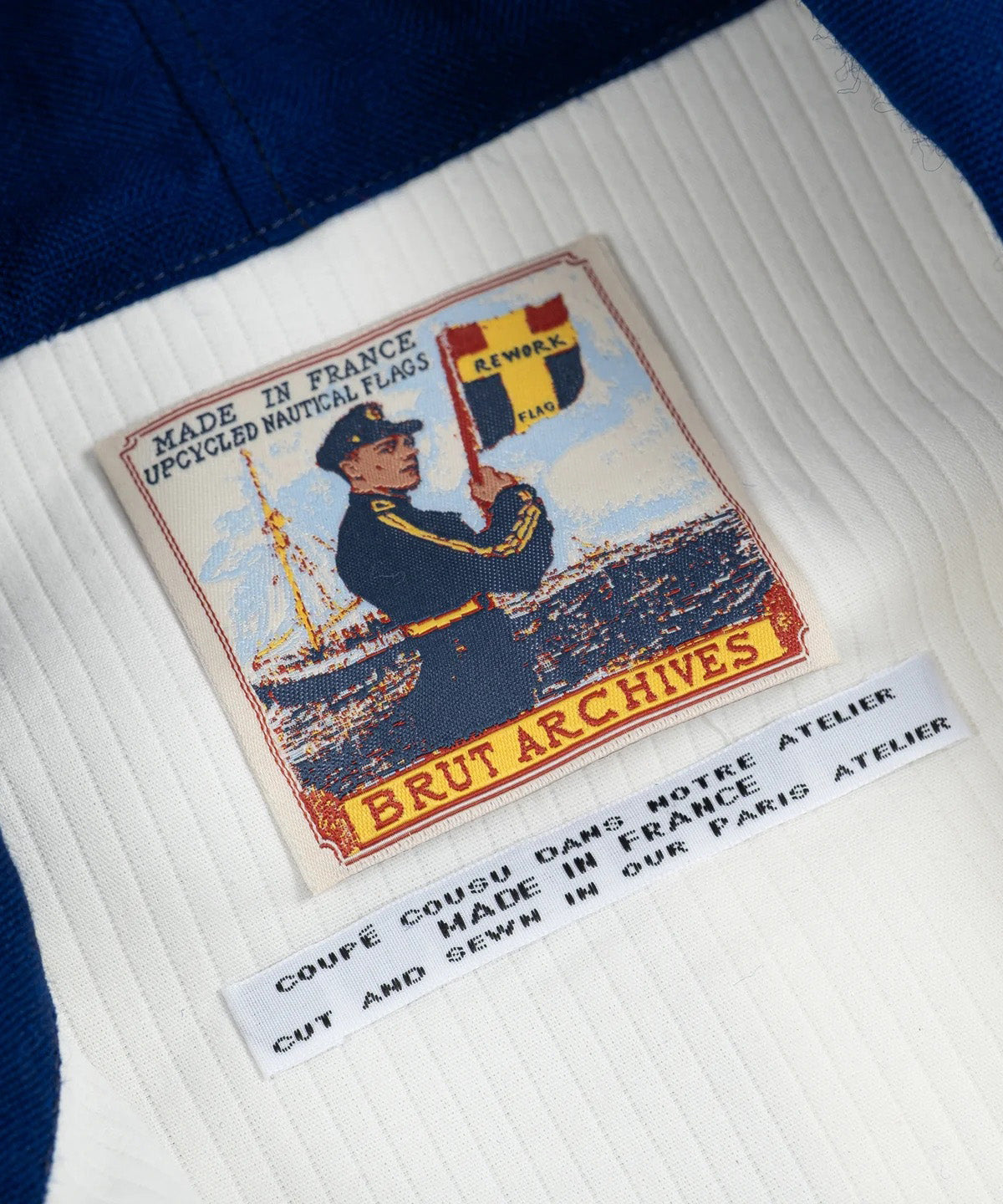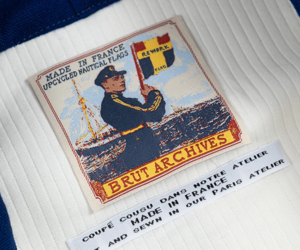 Crafted in our Parisian atelier from authentic vintage nautical flags, carefully reassembled into a bold patchwork design. Each panel carries its own story, showcasing the marks, colors, and textures of its past life at sea. One-of-a-kind.