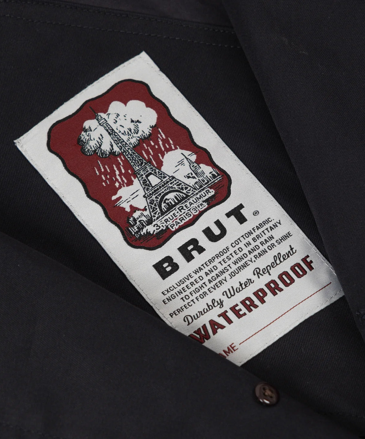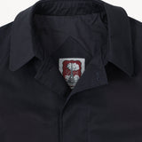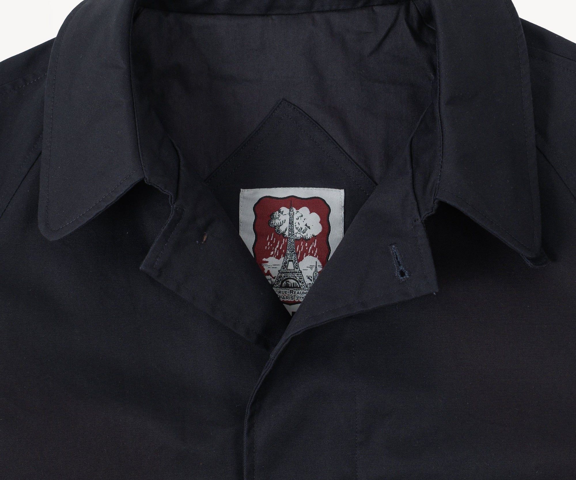 hidden button placket on front with throat latch.