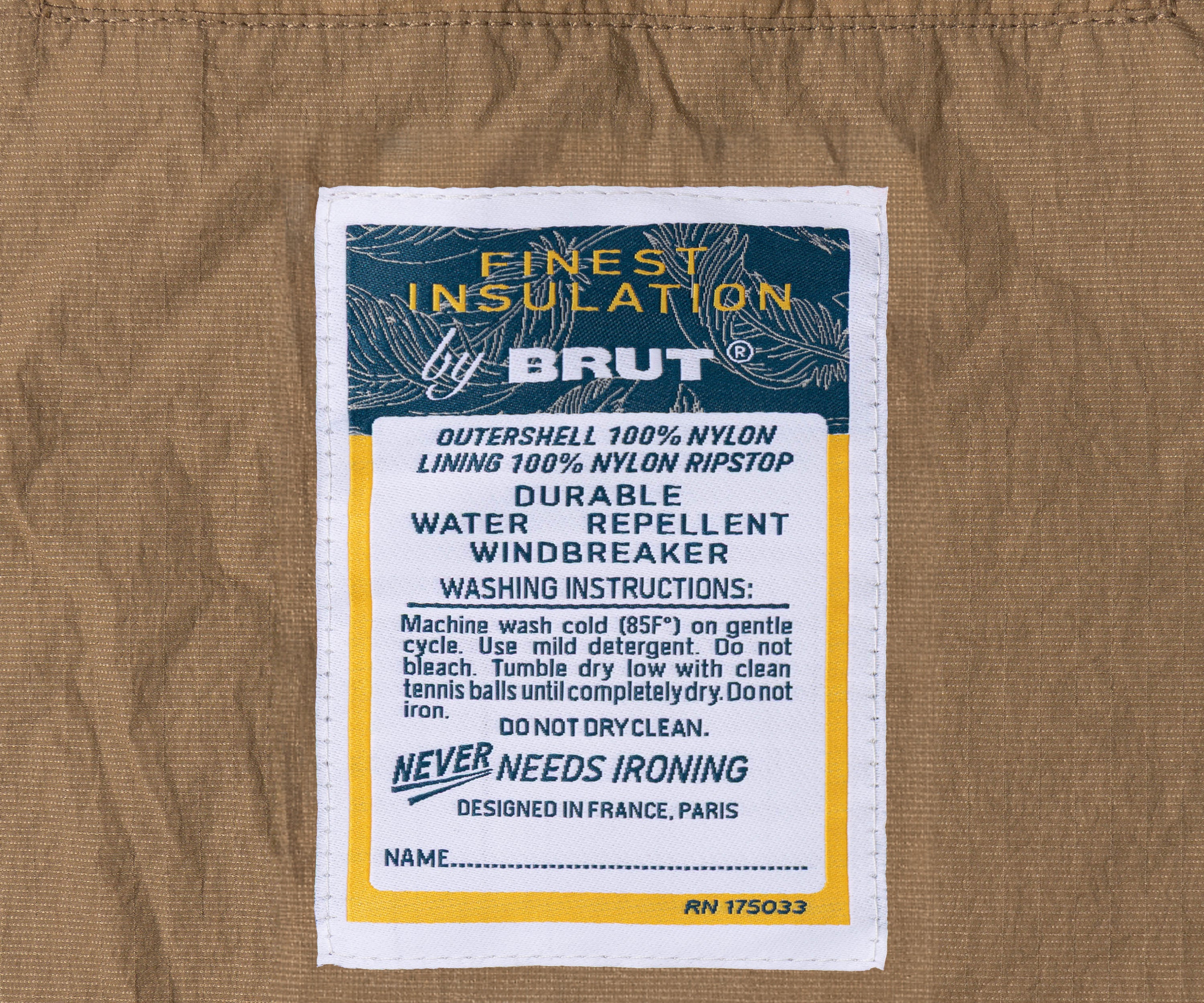 100% nylon. Down filling. Made in China.