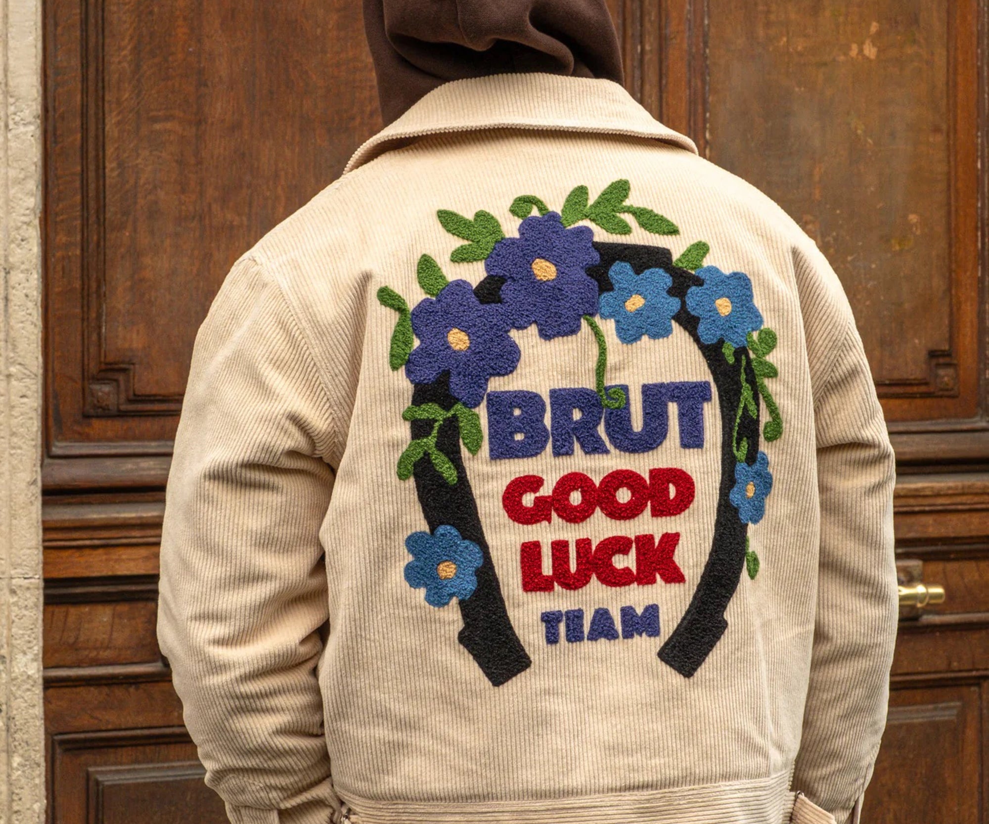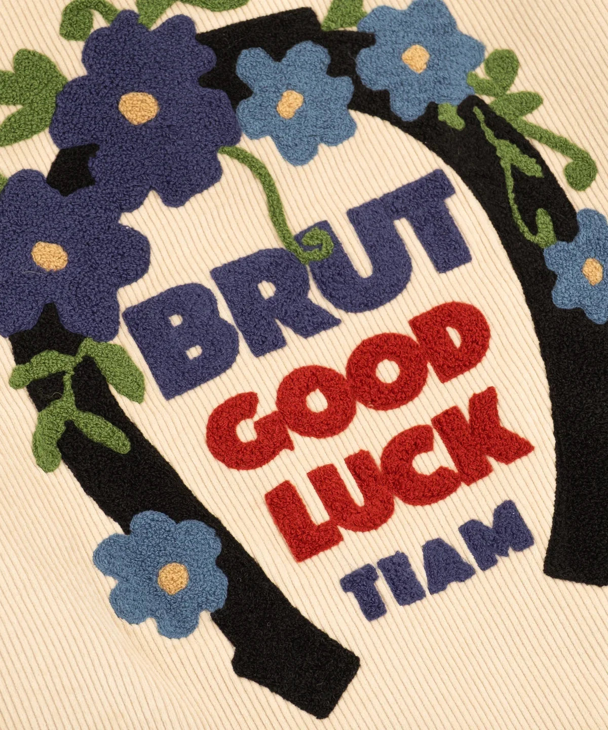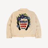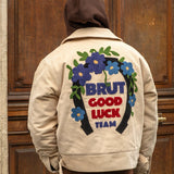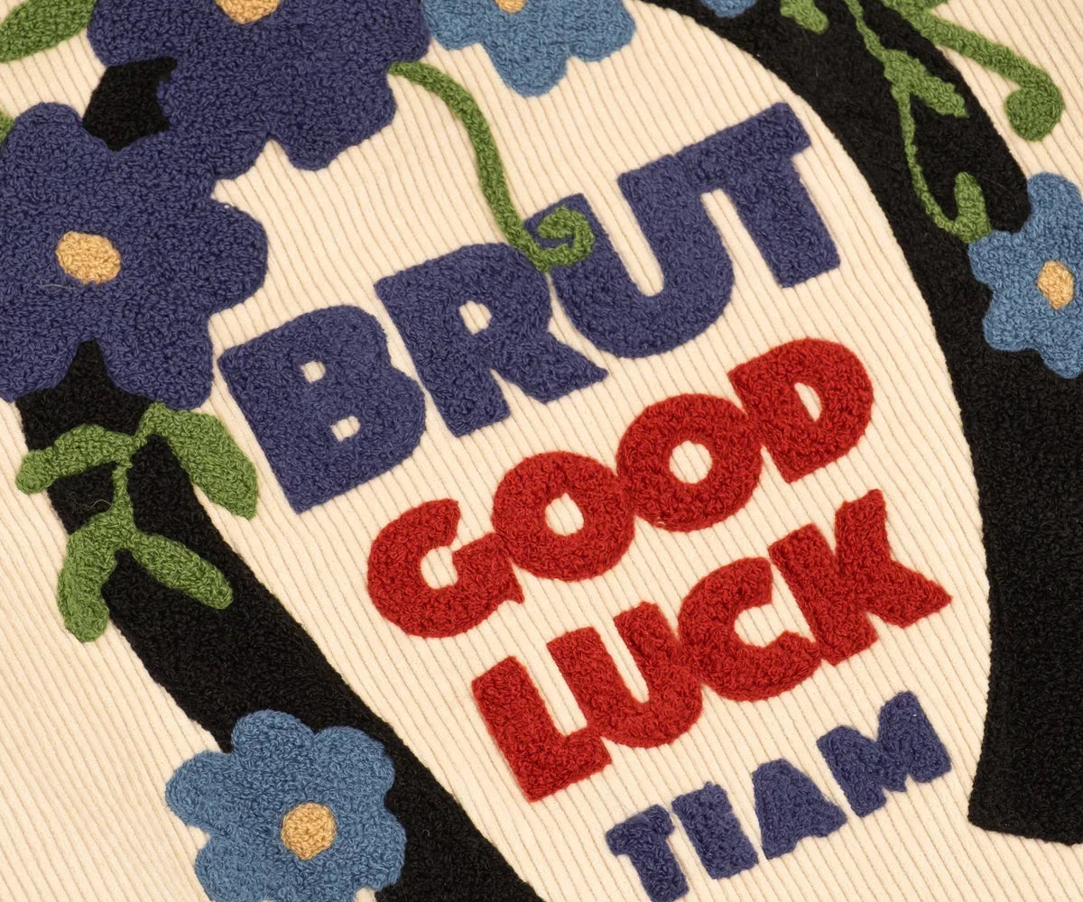 Chenille embroidery Brut Archives Lucky graphic on back.