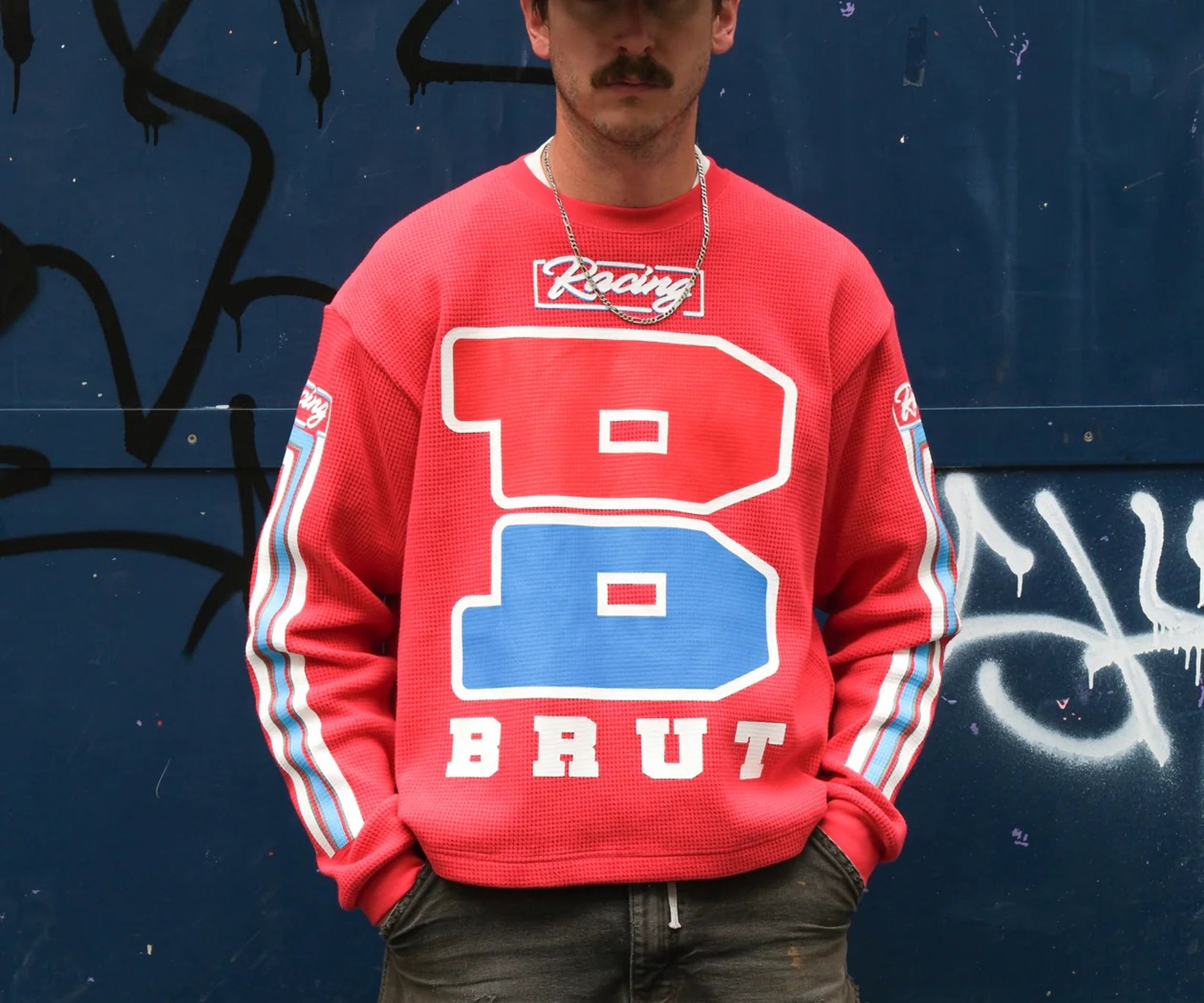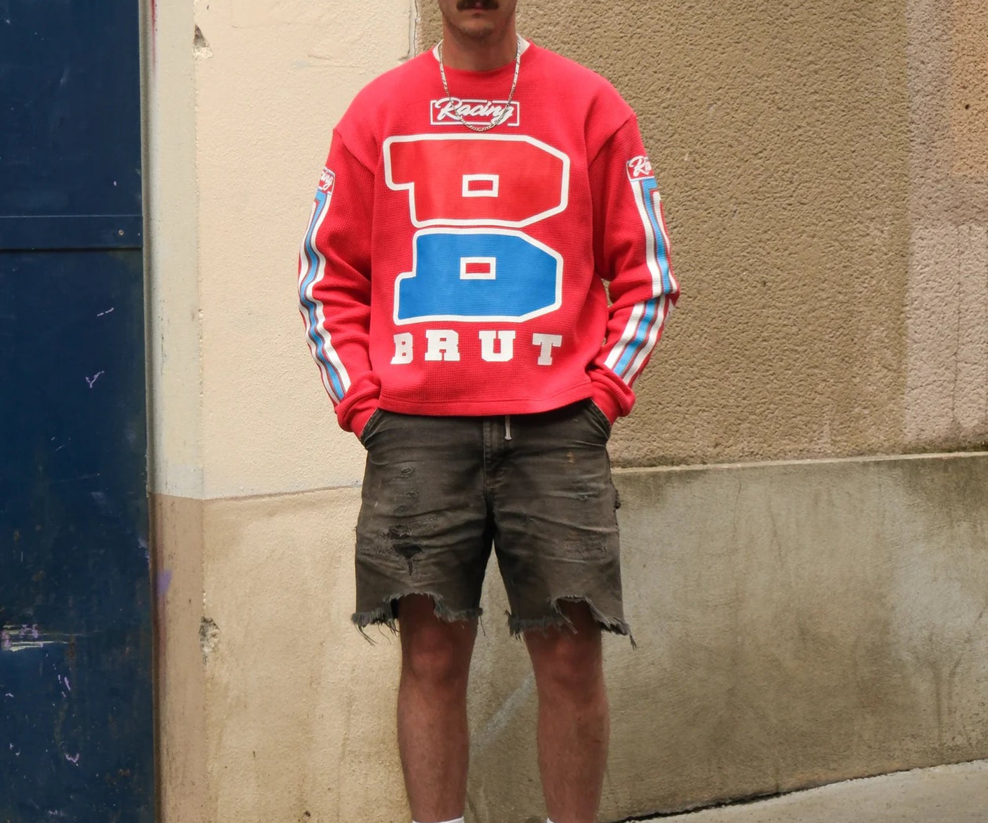 Brut Archives Moto graphics screen printed on front and sleeves.