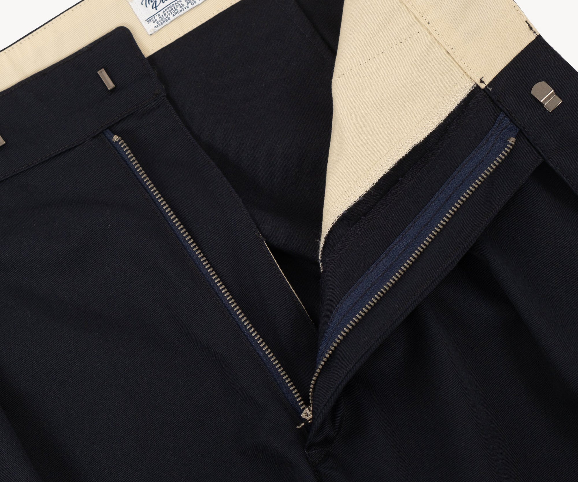 Zipper fly with hidden hooks.