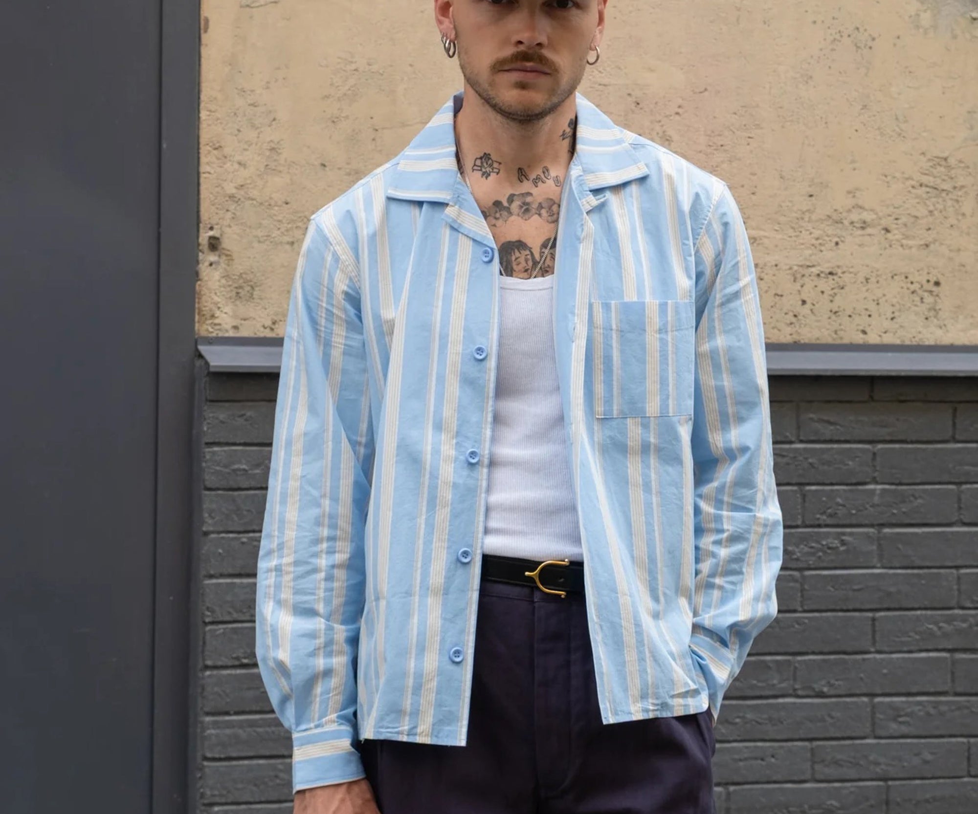 The RETIREE SHIRT draws inspiration from the classic open collar leisure shirts of the '70s. Crafted from high-quality cotton fabric.