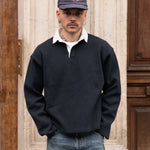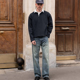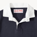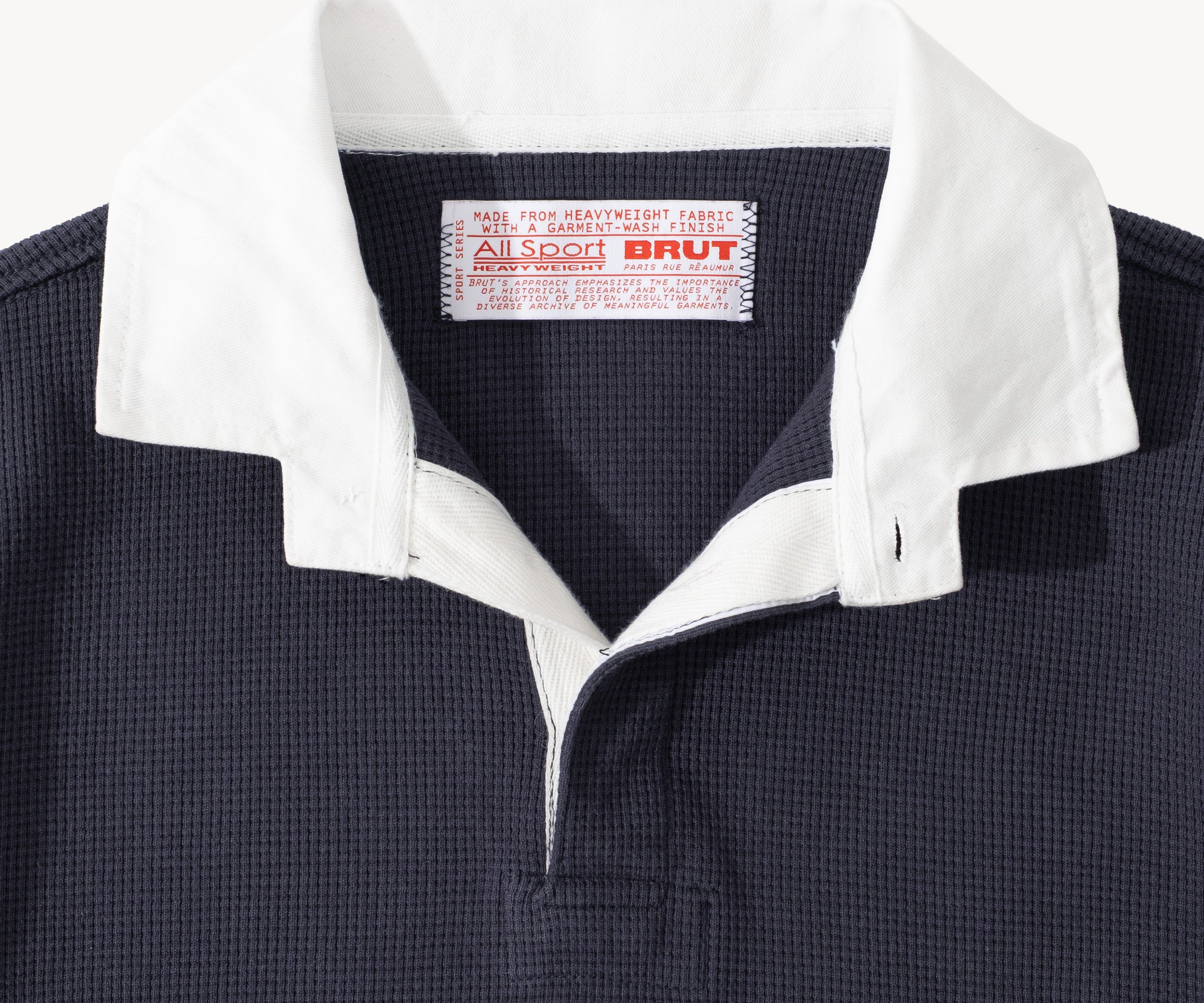 Contrasting collar and placket with button closure.