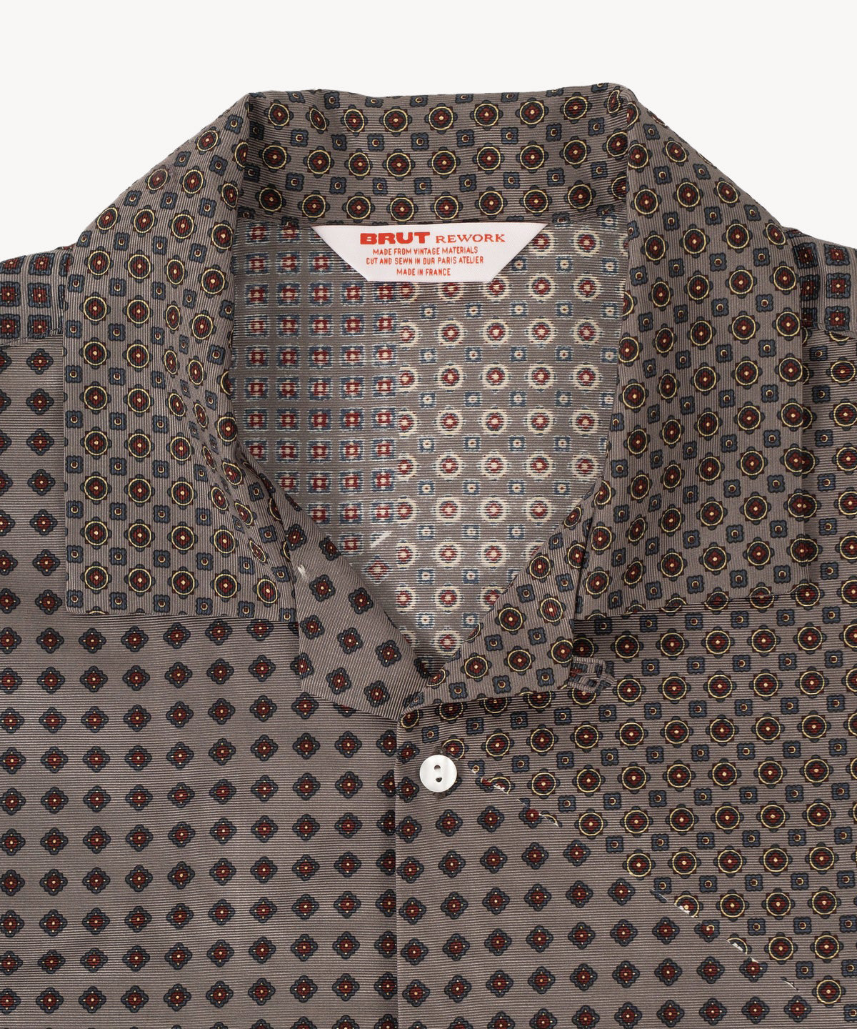 The TIE SHIRT is a mix of two rare shirts we have in our archive from the 1940's and 50's. The design consists of a short sleeves cropped shirt with a loop collar details. It is crafted from different deadstock fabrics which were intended for necktie manufacturing.