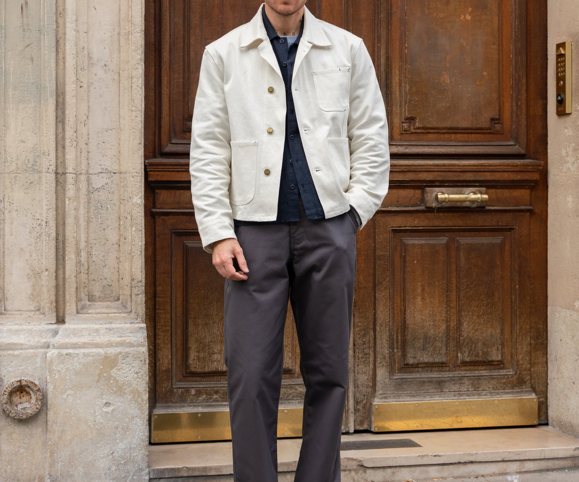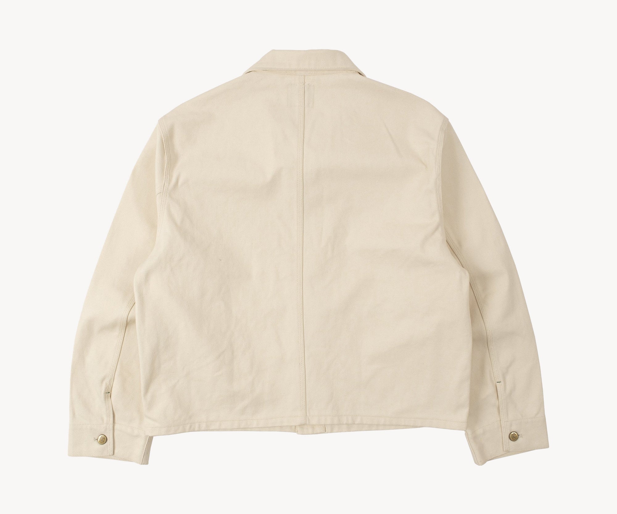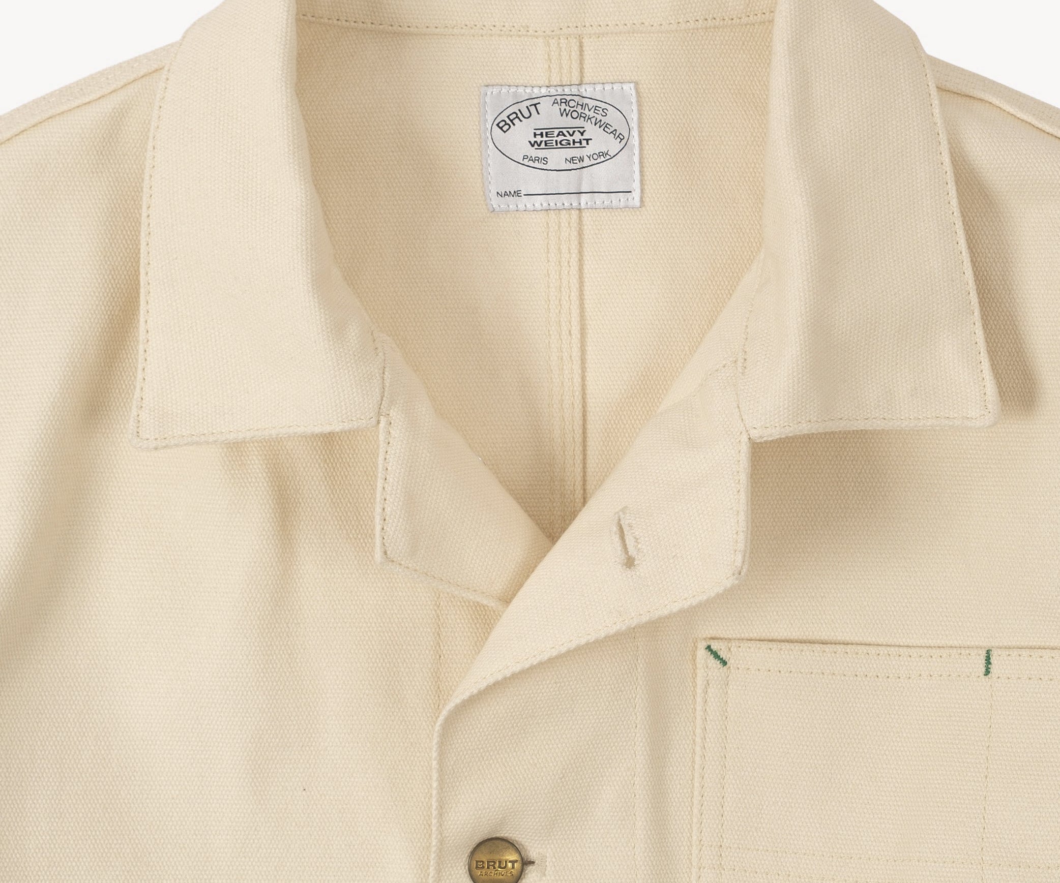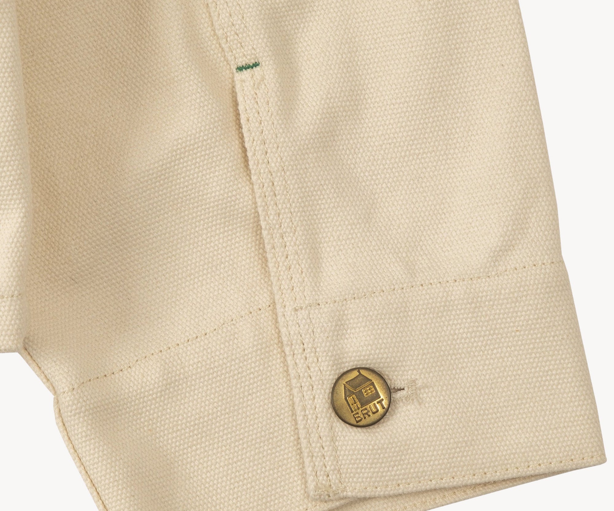 Front button closure with Brut-branded buttons