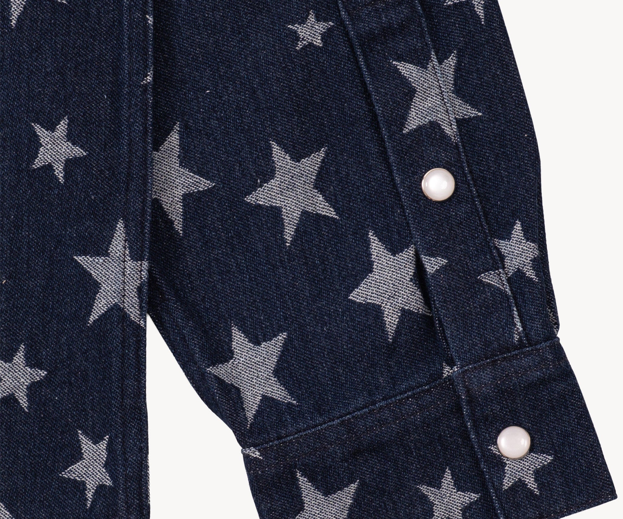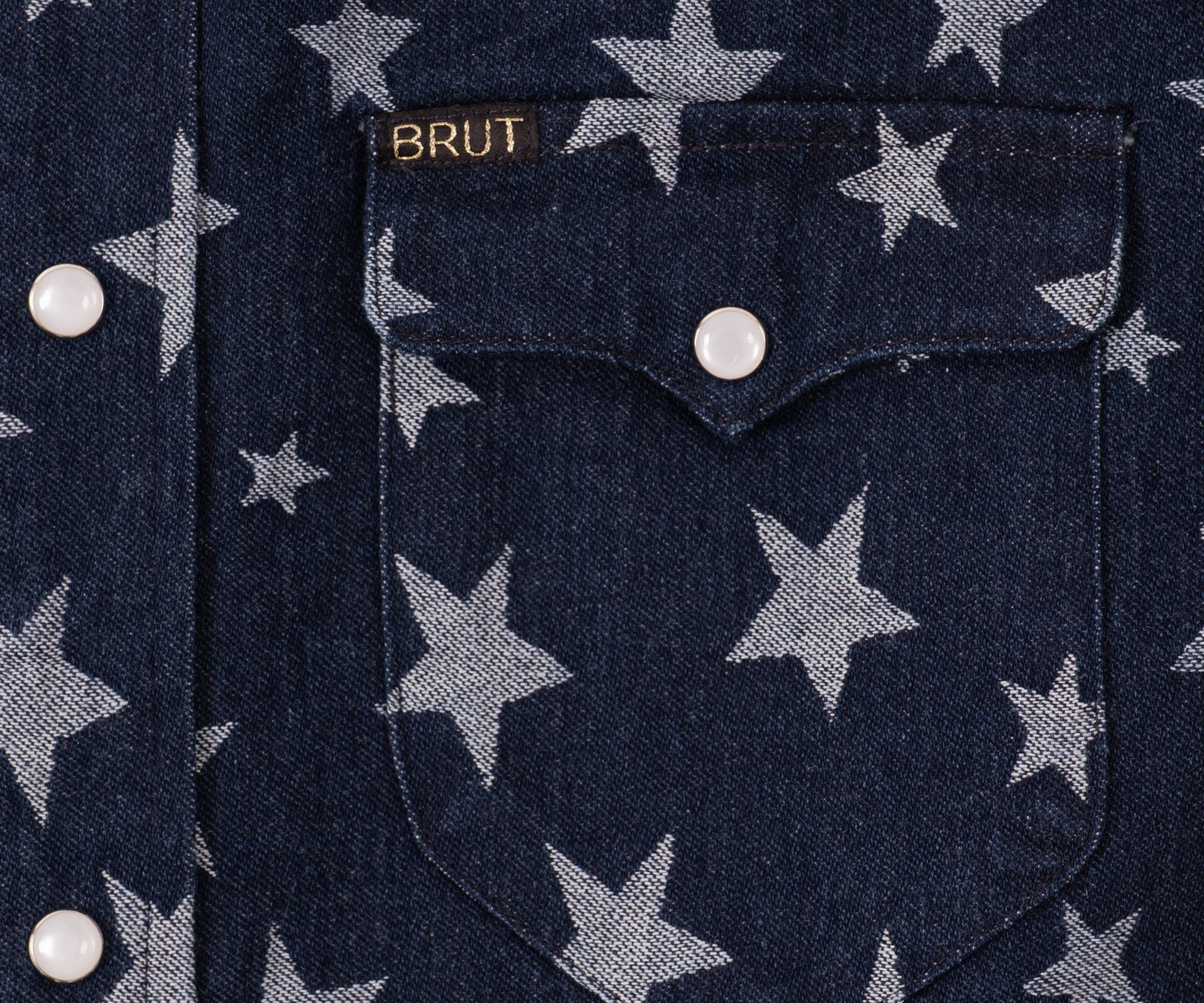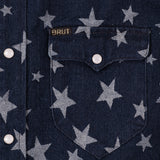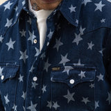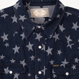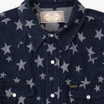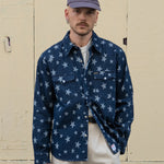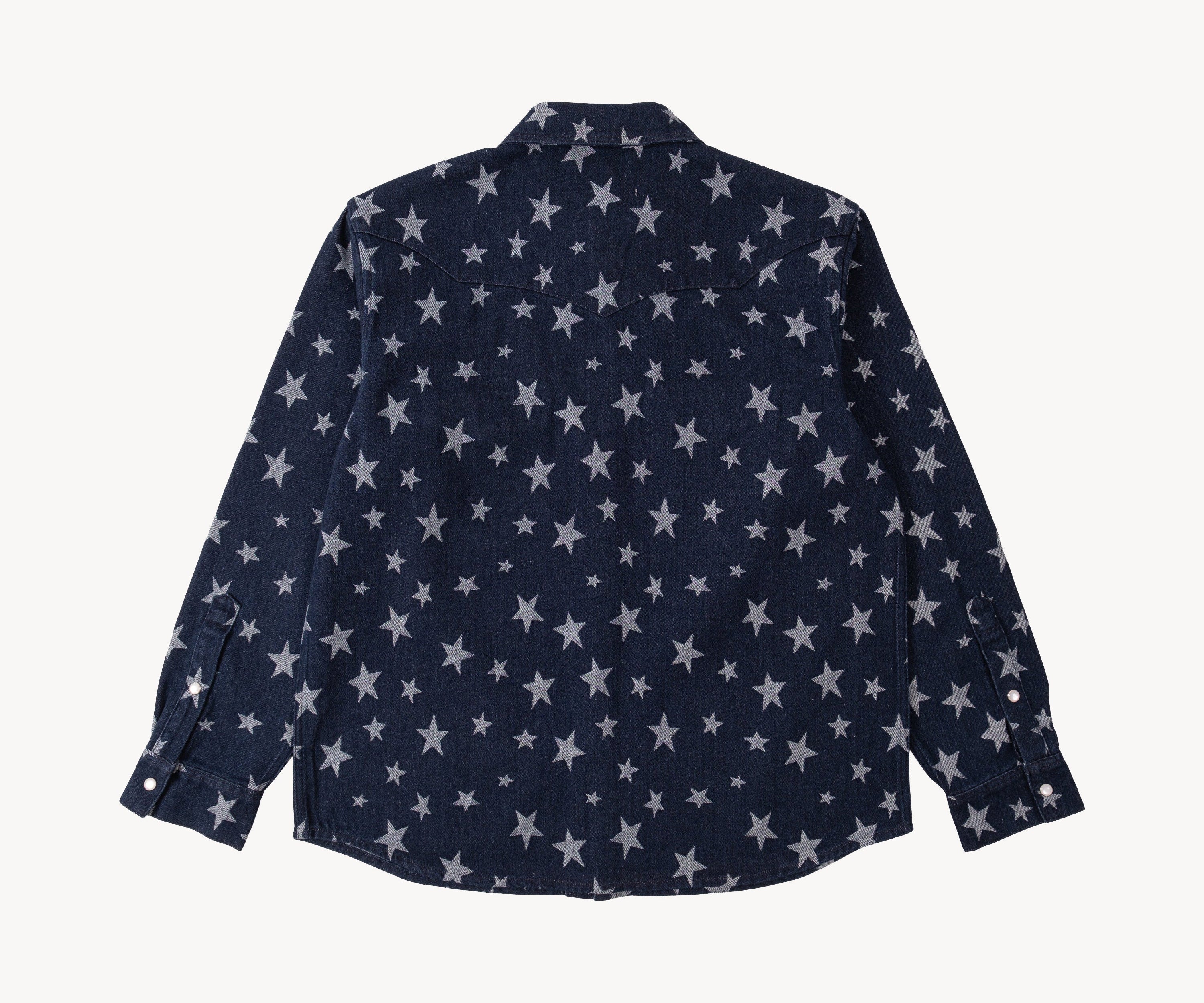 The WESTERN SHIRT draws inspiration from the timeless American denim shirt, reimagined with a unique twist. Crafted from high-quality fabric, it features a bold star pattern woven into the material.