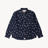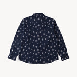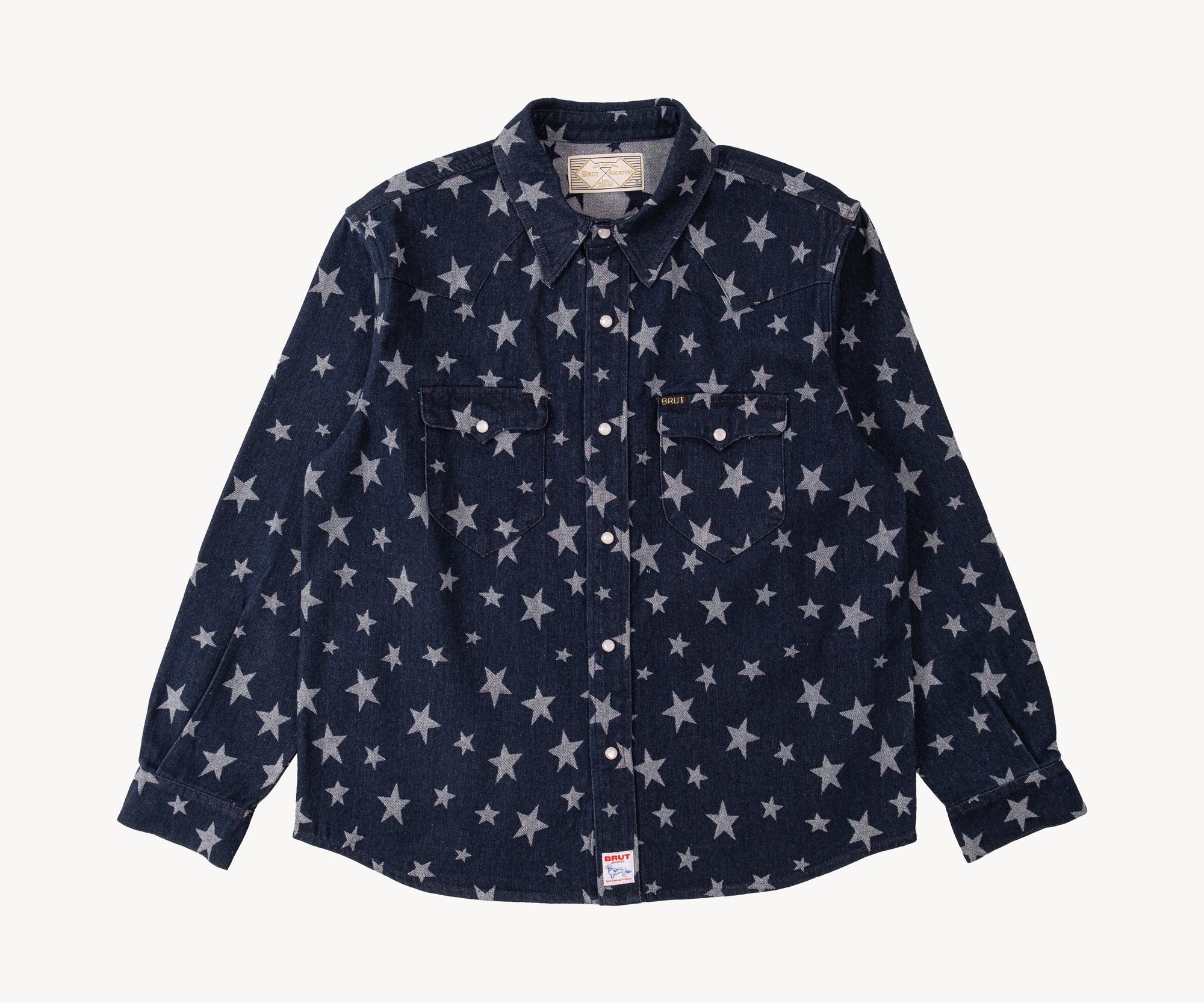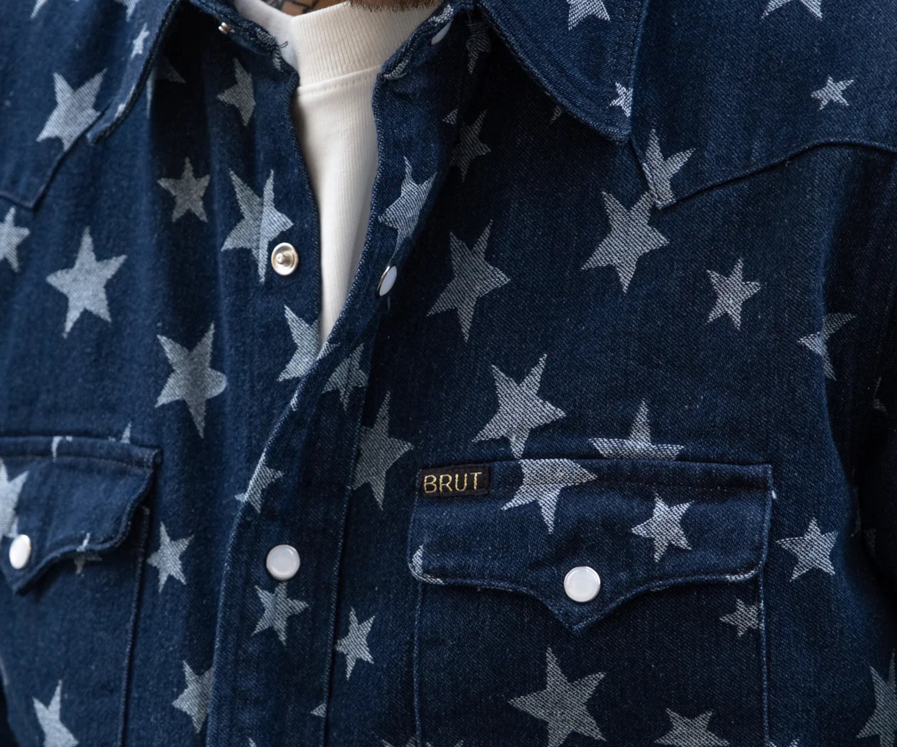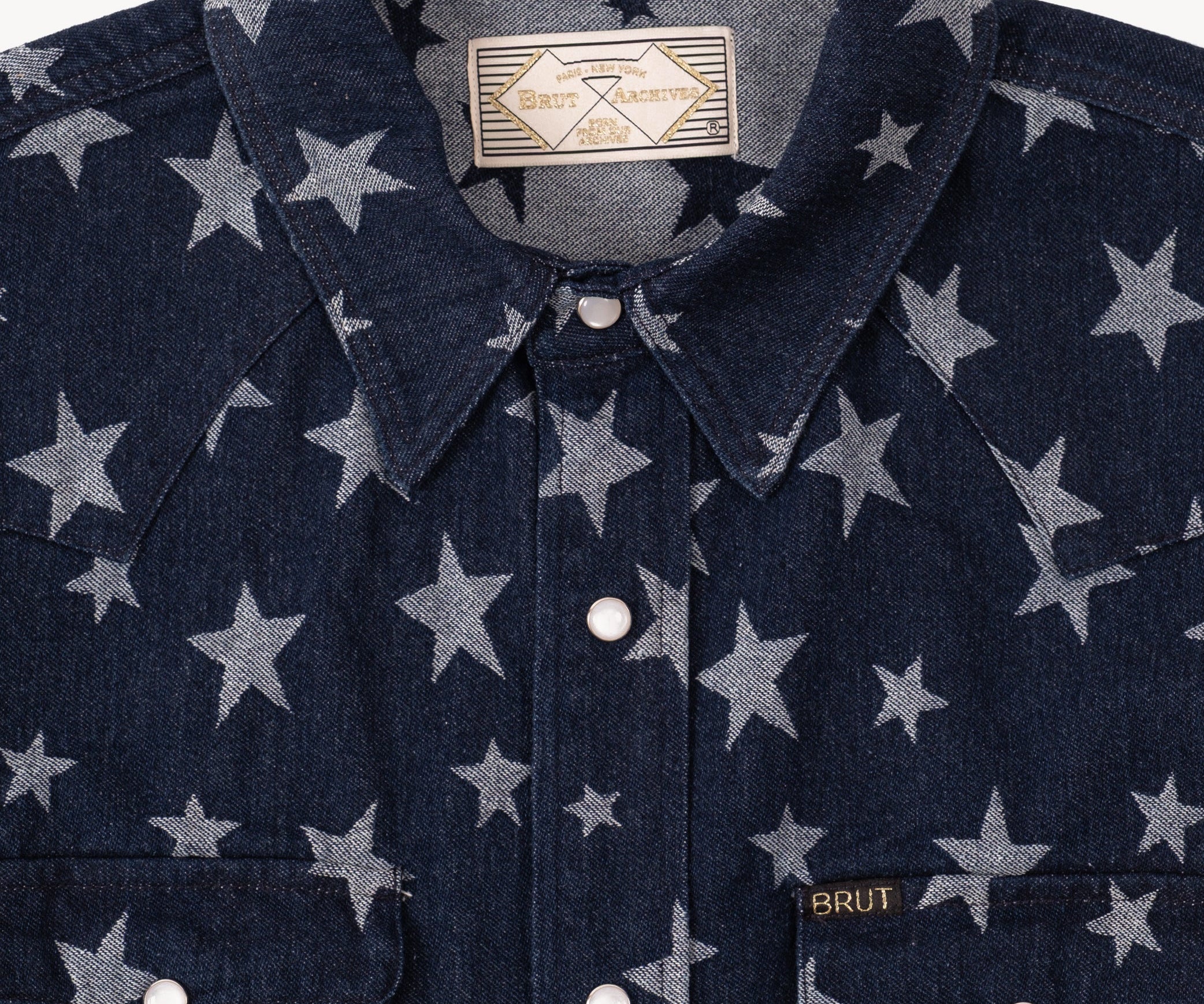 The WESTERN SHIRT draws inspiration from the timeless American denim shirt, reimagined with a unique twist. Crafted from high-quality fabric, it features a bold star pattern woven into the material.